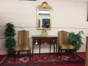 This vintage huntboard by Baker furniture has touches of the old but has a refined look. Banded mahogany and beautiful hepplewhite hardware makes it more of a shrunken down formal sideboard. Perfect for an entryway. If you have the space, it’s always nice to flank it with a pair of chairs. These Henkel Harris dining chairs fit the bill and are comfortable too! The vintage shell mirror has a great look for a formal entryway as well.