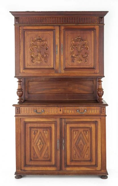 Fabulous as a bar or dining room piece, this Renaissance style cabinet has carvings on all flat surfaces. Interestingly, the upper cabinet doors have a very floral design. However, the lower cabinet doors have a much simpler geometric design. This mix adds quite a bit of visual interest to the Renaissance style cabinet.
