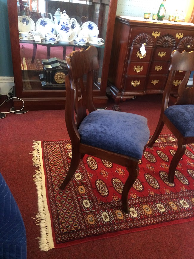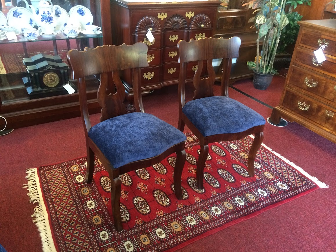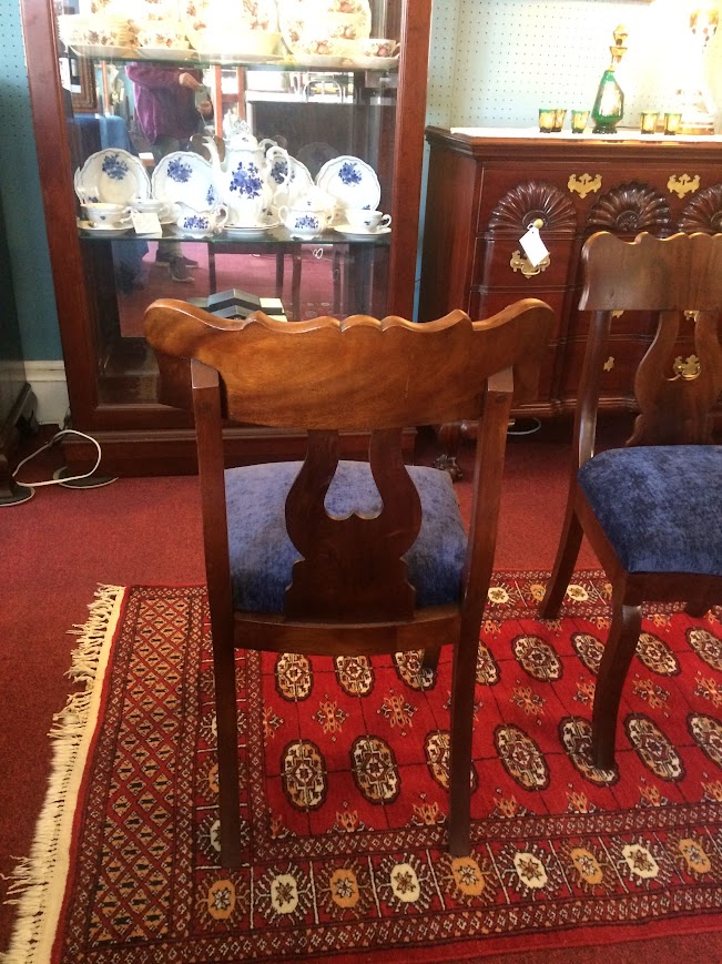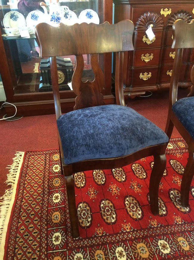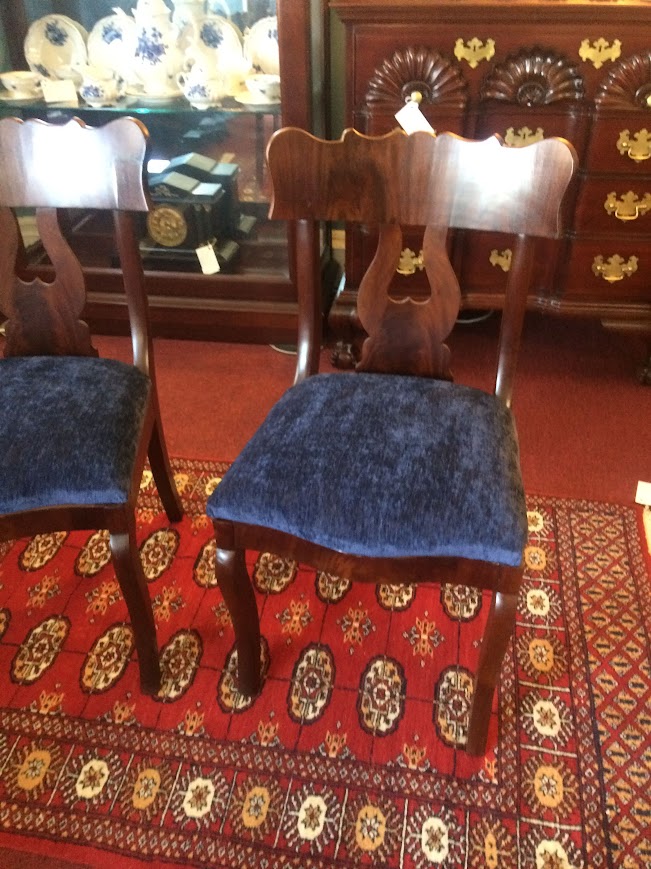 These antique Empire chairs have a lovely design, with flame mahogany backs and upholstered seats. Of course, these chairs have been nicely refinished and reupholstered. They have a nice textured velvet fabric seat.