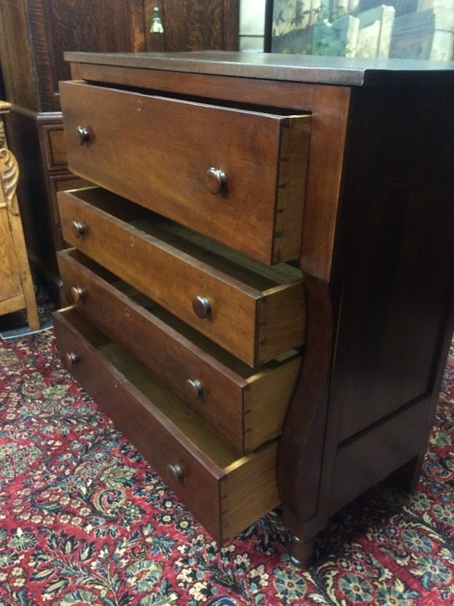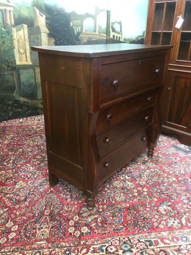 This nice antique Empire chest of drawers has four drawers, with a larger drawer on top. Of course, it has a lovely warm cherry wood that varies throughout. Additionally, it has pretty scrolls on either side and nice turned bun feet.