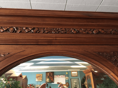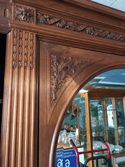 Of course, the wardrobe features three sections. The two outer sections feature convex doors that close towards the center. The center section features a large beveled mirror.