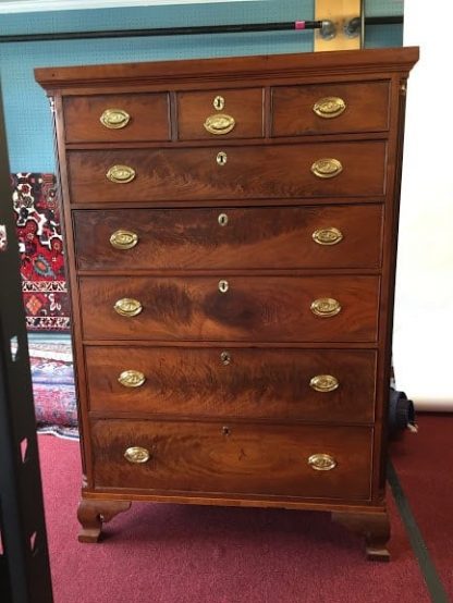Antique Federal chest of drawers – Mahogany wood and stunning! This gorgeous circa 1800 Period chest has incredible patina and beautiful detail. The mahogany grain patterns on each drawer simply sing! Three smaller drawers sit above five graduated drawers. Lovely scroll bracket feet and beautiful fluted corners complete the elegant design.