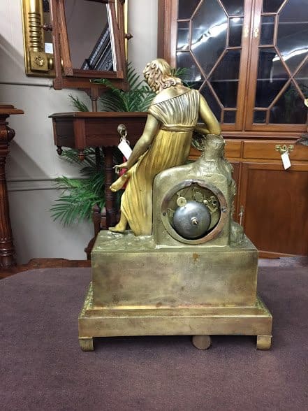 The box that she sits upon is decorated with birds and flowers. The clock is an open face, common for 19th century French clocks of this period. Freres Nicole opened in 1814 and is best known for their intricate and well made music boxes. Here, the figure featured in the clock appears to have held something at one point, perhaps a musical instrument. Sadly, this piece is missing from the clock sculpture.