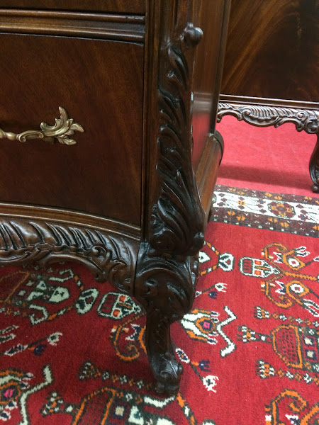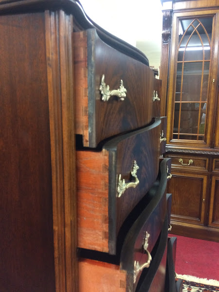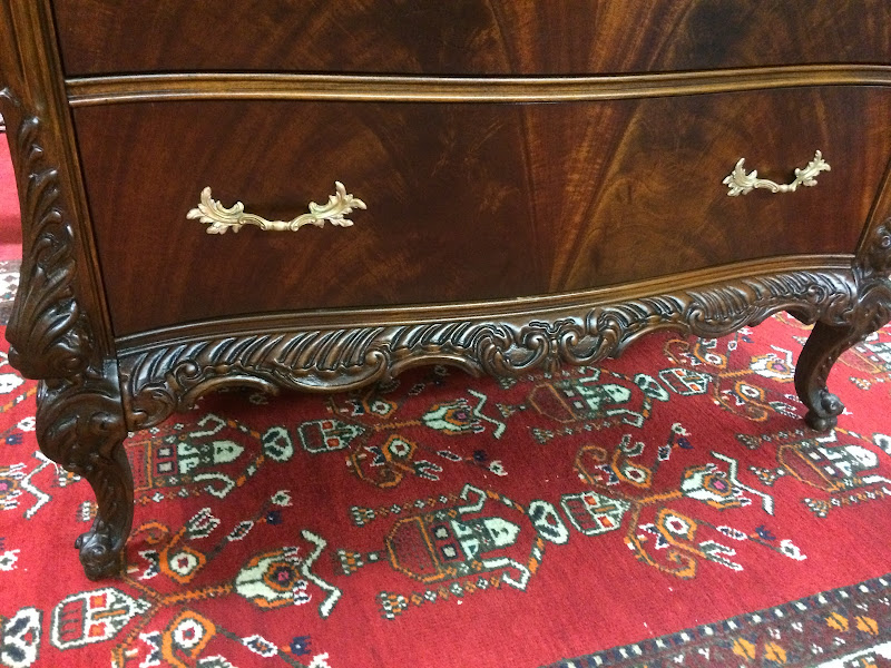 The chest features a total of six drawers. Of course, each drawer offers a slightly different depth. Also, the chest has beautiful flame mahogany book matched on each drawer face. Additionally, the chest has lovely carvings along the edges and feet. Finally, the chest has beautiful brass French style hardware.