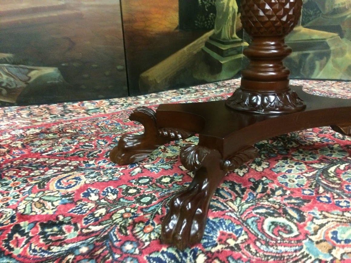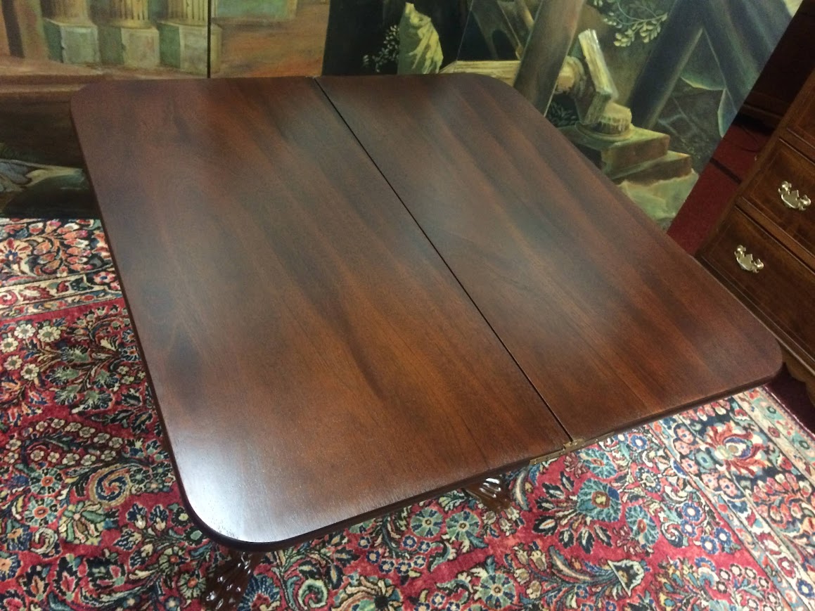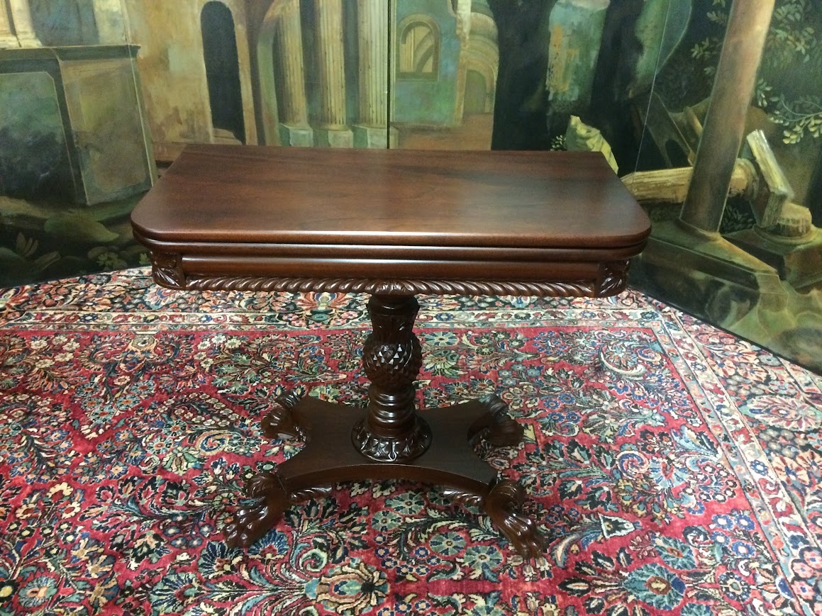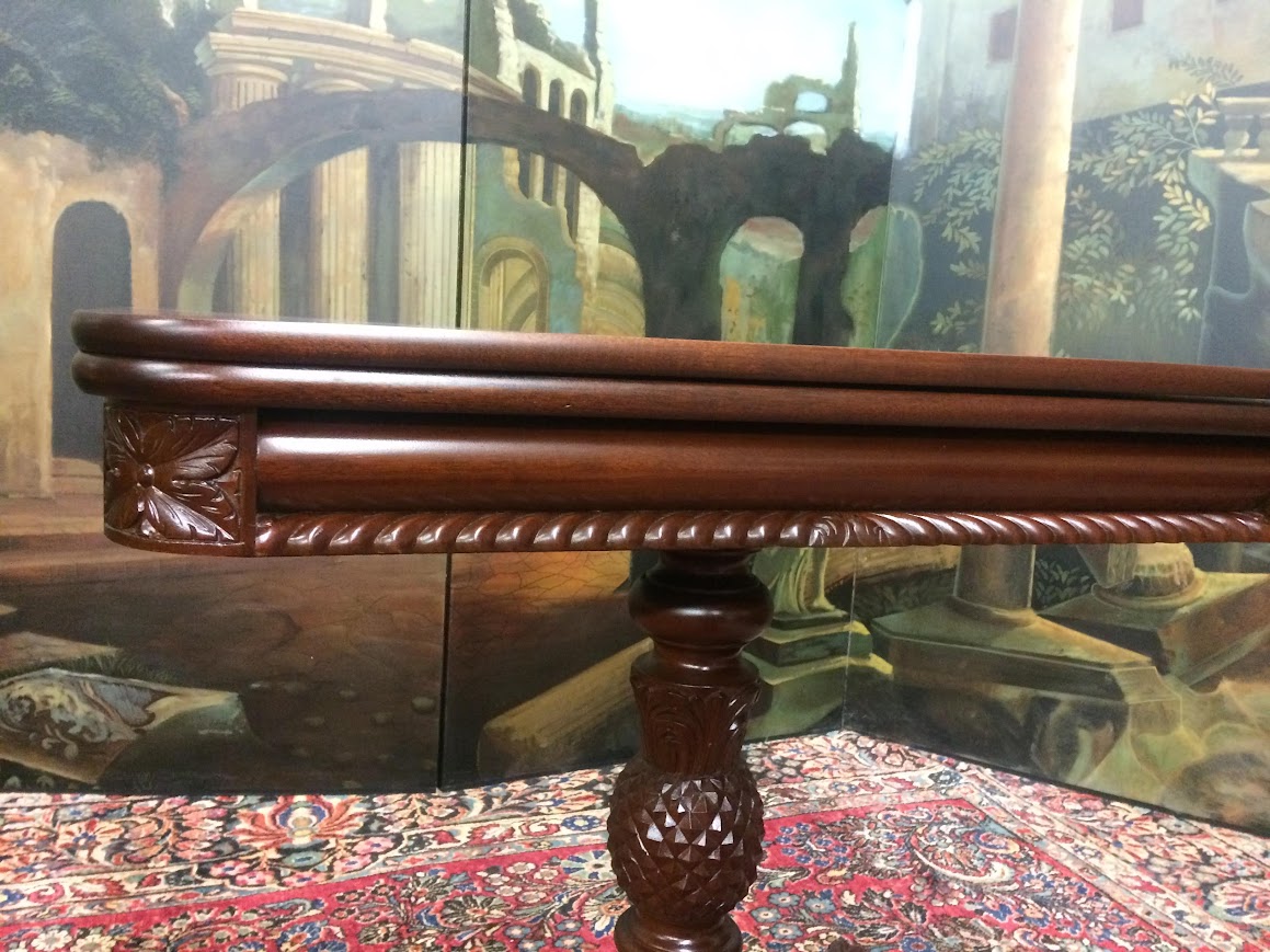 We refinished this carved Games table in order to restore the beautiful mahogany wood. It shows well.
