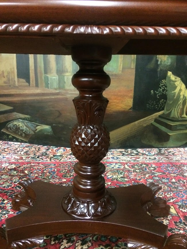 This lovely antique games table has a beautiful carved pedestal base, with lovely pineapple shape in the center. Also it has lovely paw feet that extend outwards.