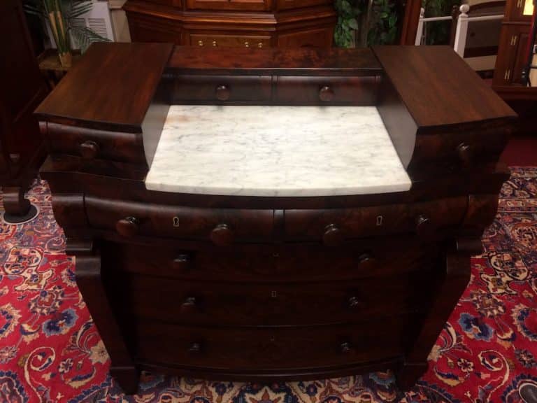 This beautiful antique Empire Chest of drawers has a nice “step-down” shape. It has two small drawers on the top, then, two small drawers on either side of the marble. Additionally, the chest has two over three drawers. Each drawer has beautiful “book-matched” veneer on them, and a gentle curve. Finally, this antique Empire chest has pretty curved elements on either side of the drawer.