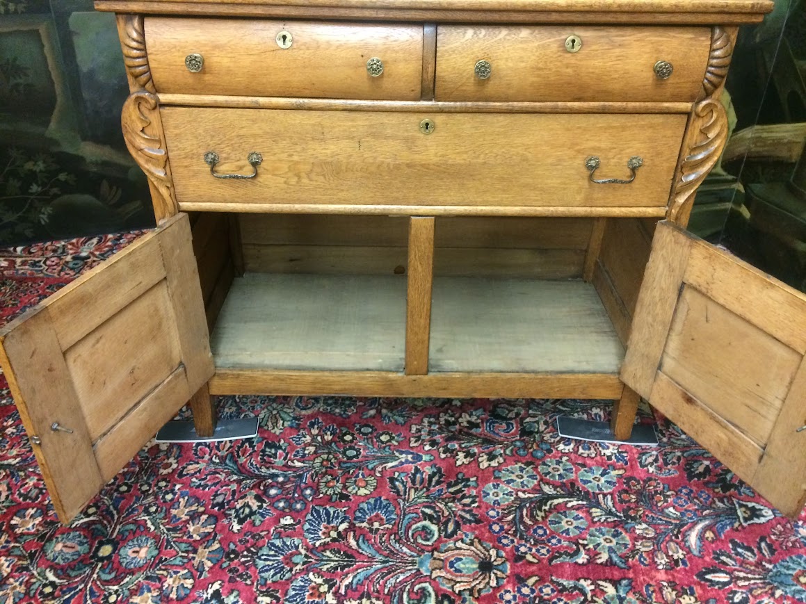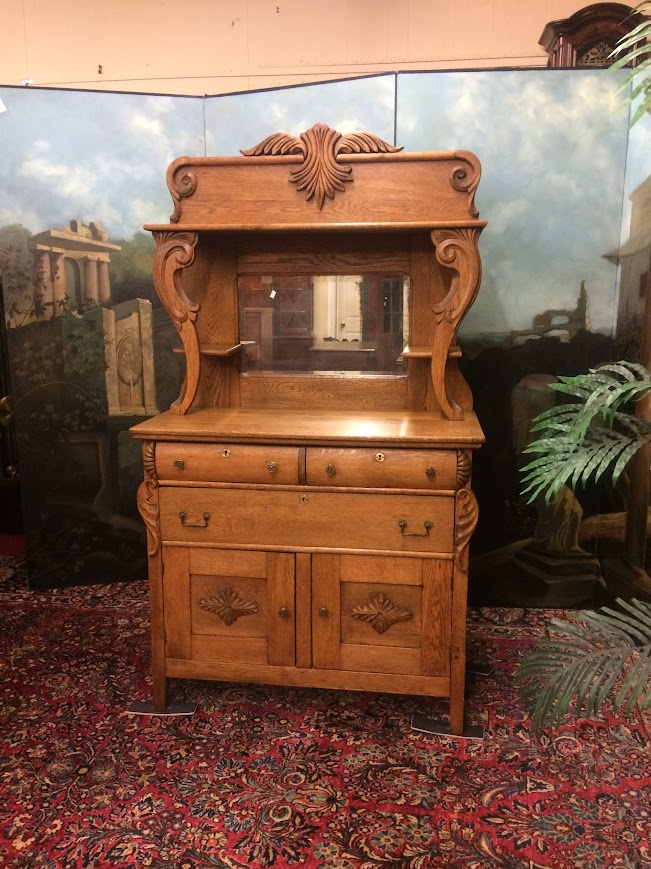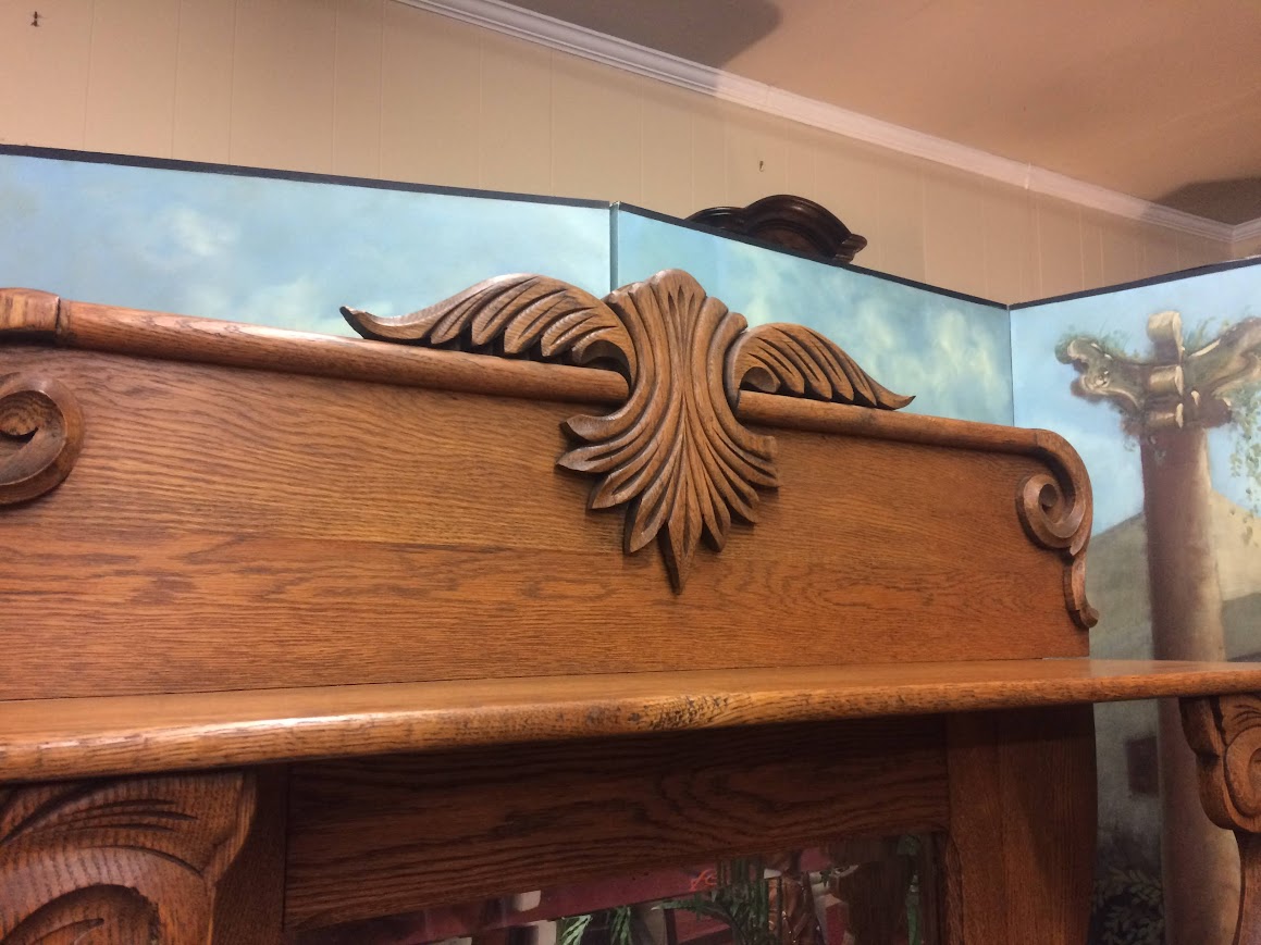This Antique sideboard has drawers and cabinet spaces. Also, it has a fancy ornate backsplash with carved details and a beveled mirror inset inside.