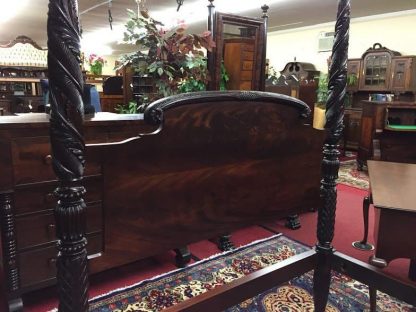 There are several design features that categorize this as an Antique Empire Bed. Particularly, the thickness of the posters, the rich mahogany grain and the heavy ornamentation speak to Empire Style tastes. The Napoleonic style popular in France made its way to the Americas in the 1820’s. Americans loved the strong and imposing look of French Empire Style. They mimicked the strong and block-y look of French Empire Furniture in Empire Dressers, Empire Sofas and in this Antique Empire bed.