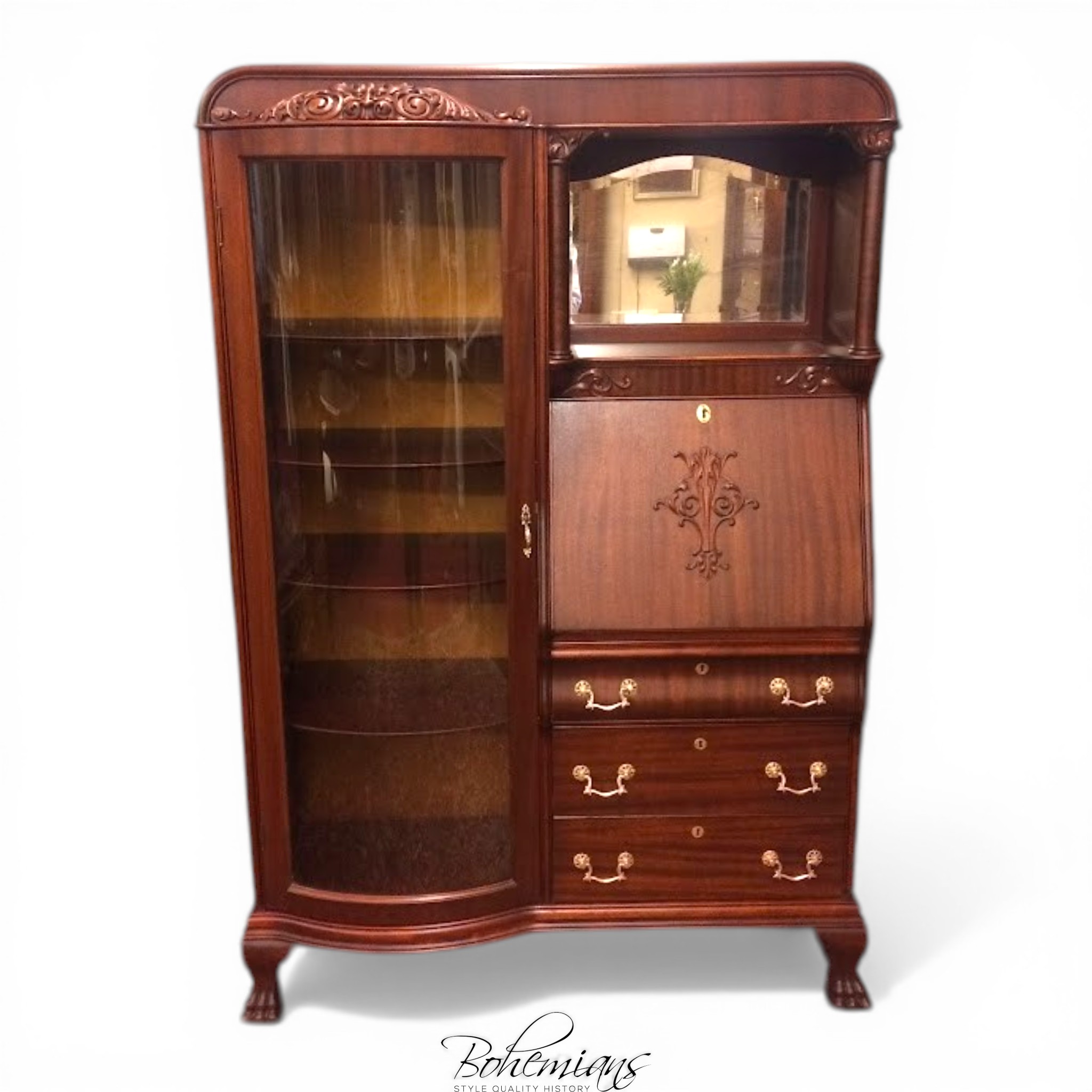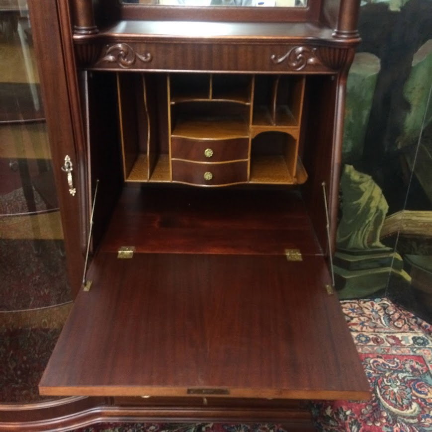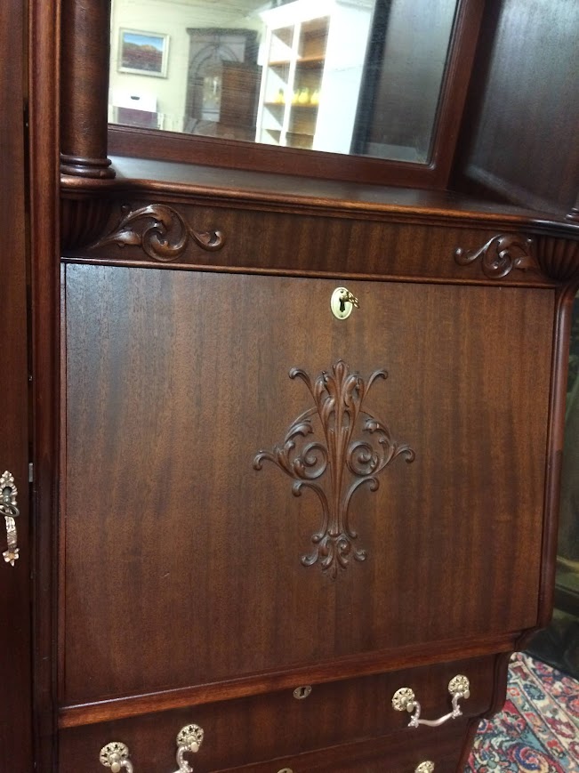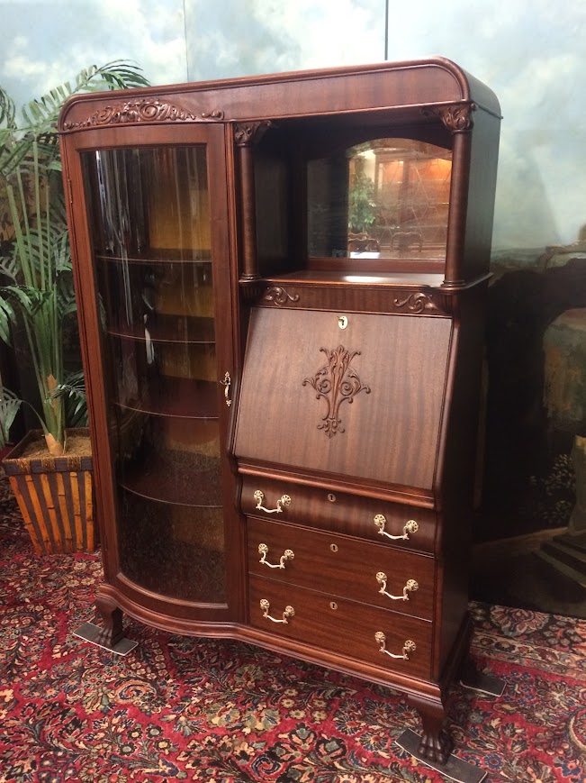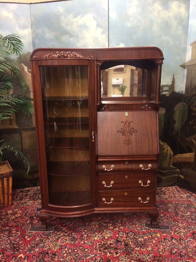 We refinished this antique side by side secretary desk in order to restore the lovely mahogany veneers. There are some places on the top of the desk that were patched and repaired. The mirror also has several signs of age. Please see photos.