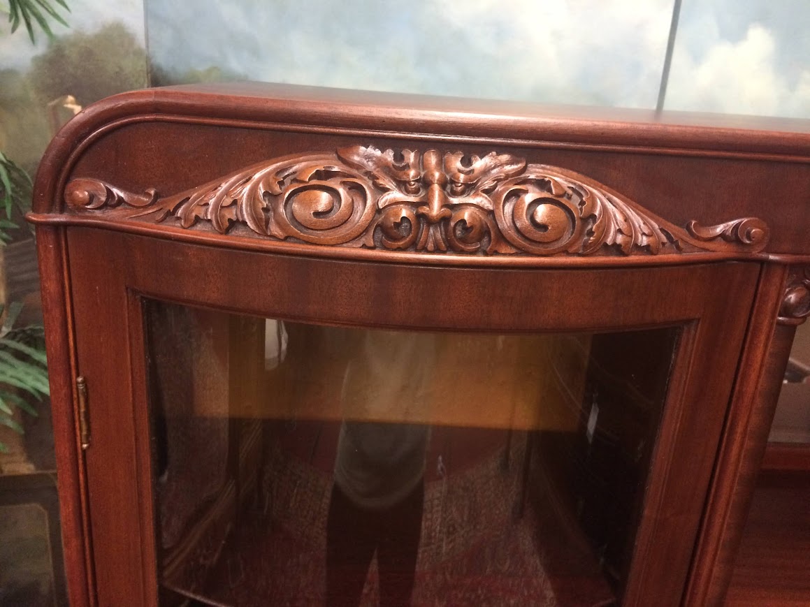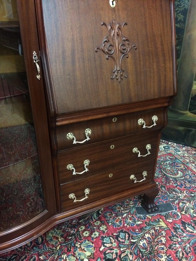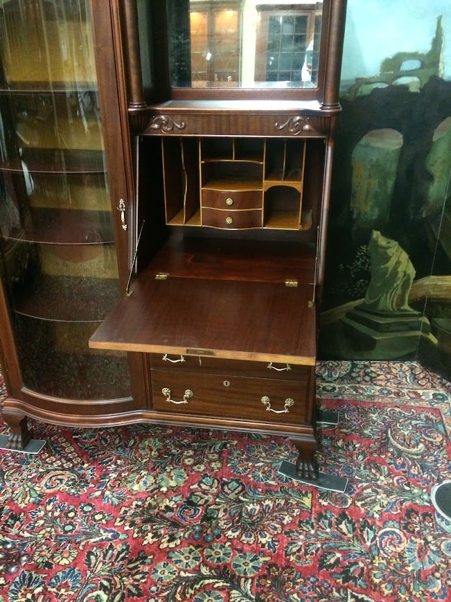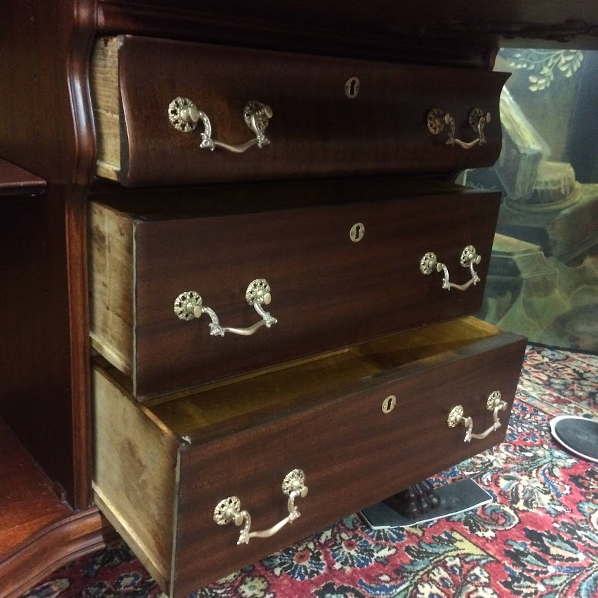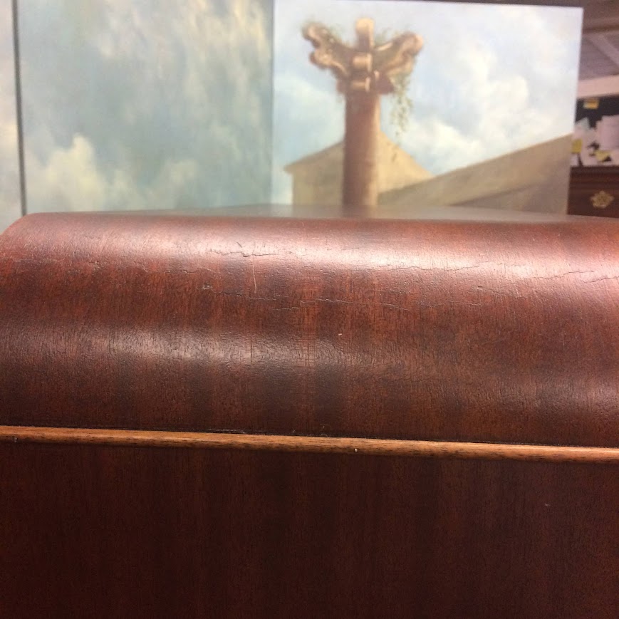 We refinished this antique side by side secretary desk in order to restore the lovely mahogany veneers. There are some places on the top of the desk that were patched and repaired. The mirror also has several signs of age. Please see photos.