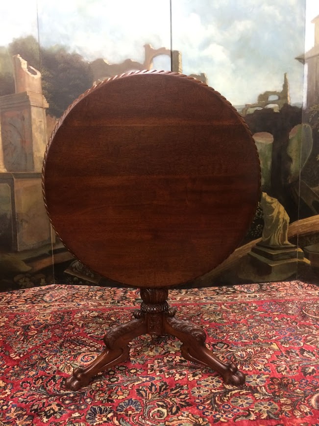 Beautiful antique tilt top table in solid mahogany. This lovely mahogany Empire table has a lovely carved base and beautiful design.