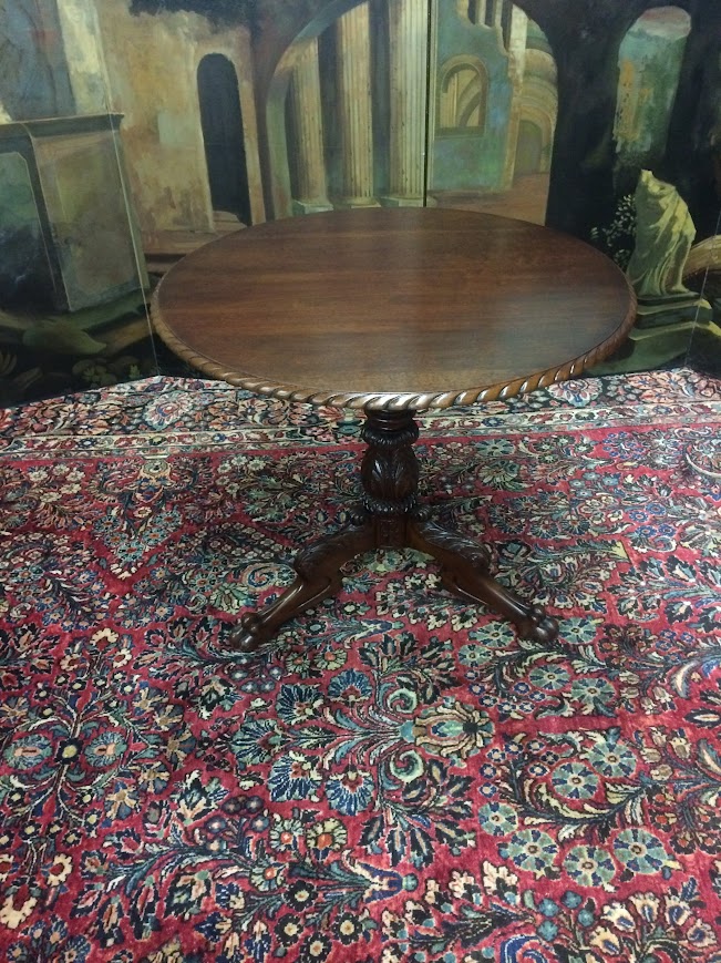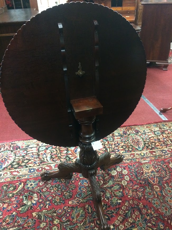 This lovely antique tilt top table has a beautiful design. It features a lovely carved base that resembles a pineapple. Additionally it has lovely carved feet that splay out from the base.