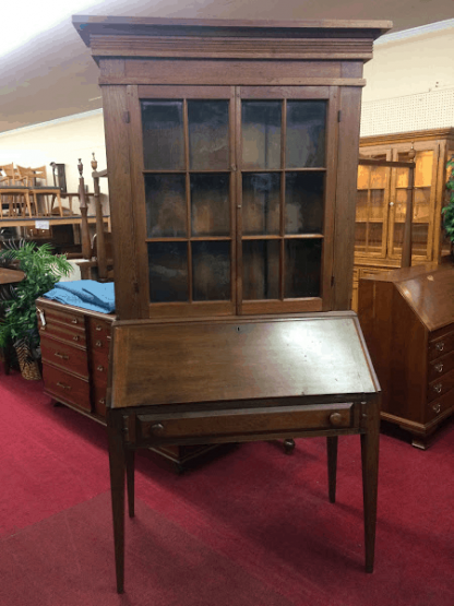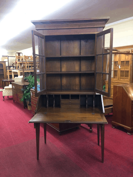 Of course, the antique desk is a two part desk. On top, there is a set of beautiful wavy glass doors. Underneath, there is a really nice slant front secretary desk that rests on two supports. Also, there is a center drawer.