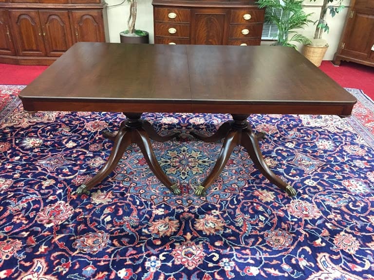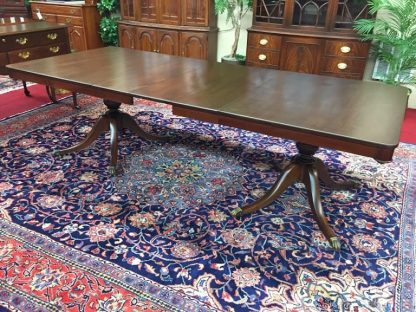 Berkey and Gay Antique Dining table with three boards. This antique mahogany dining table features two four legged pedestal bases (each with brass cap and wheels). The dining table has rounded corners and a nice apron.