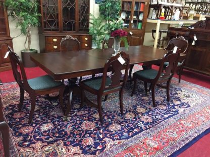 This antique dining table was made by furniture company Berkey and Gay in circa 1900-1915. We refinished the table in order to bring it back to its original beauty! It has great lines and coordinates very well with our set of six antique chairs.