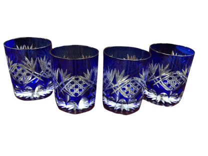 Beautiful deep cobalt blue cut to clear Bohemian crystal glasses for $49 each ($196 for the set of four). These hand cut crystal glasses are made in the Czech Republic or Hungary. Blue Bohemian glasses are rare and high quality.