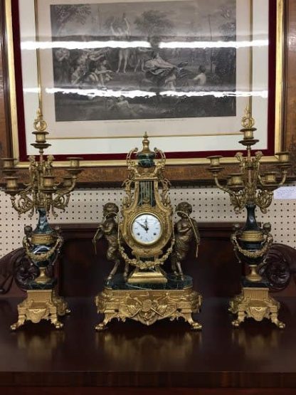 The design of this Clock and Candelabra set makes an incredible statement as a mantel clock. The faun (half-goat, half man) creatures on either side of the clock carry a garland of flowers that sways below the clock face. These mythological creatures add a touch of fantasy to the set. Furthermore, the cast metal clock setting is framed by polished green marble base and top finial. All the pieces, including the green marble, hail from Italy.