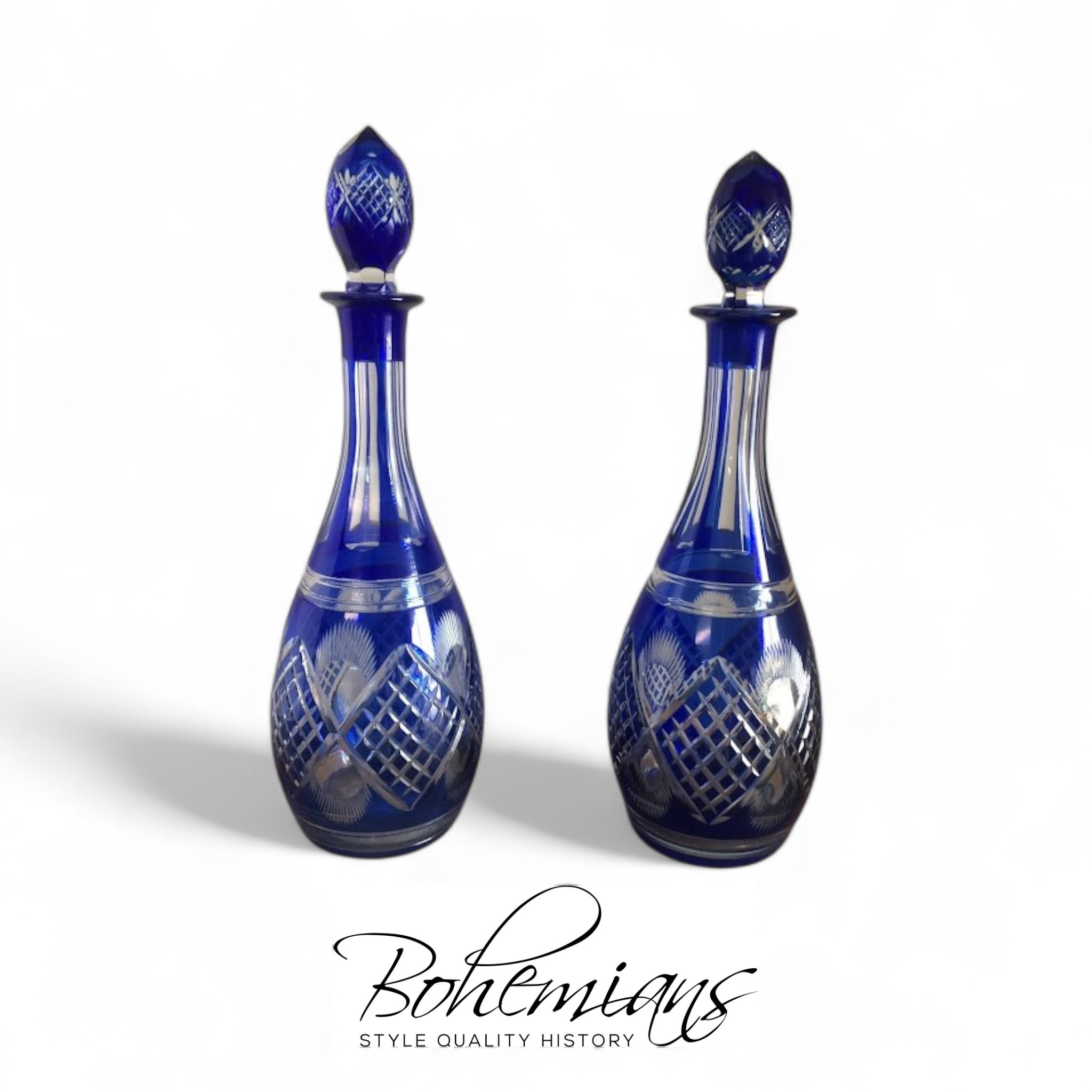 The lovely tall decanters are nearly identical in pattern. Of course, they are cut by hand, so you may see a bit of variation in the patterns. Each decanter has a wide base and tall neck. They each have a cut glass stopper, also in lovely cobalt blue.