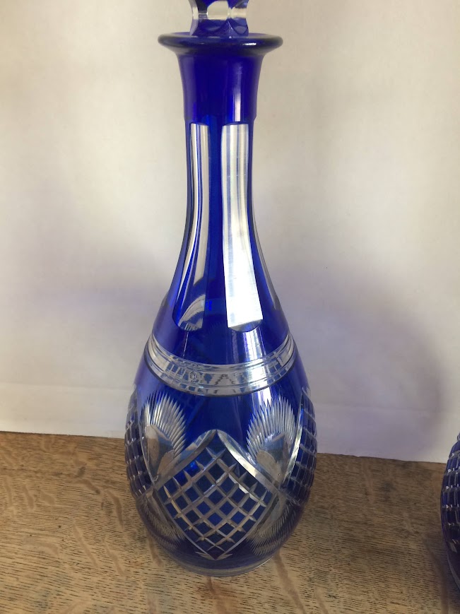 Beautiful cut to clear cobalt blue crystal decanters. These nice tall decanters are perfect just for display or for holding your libation of choice.