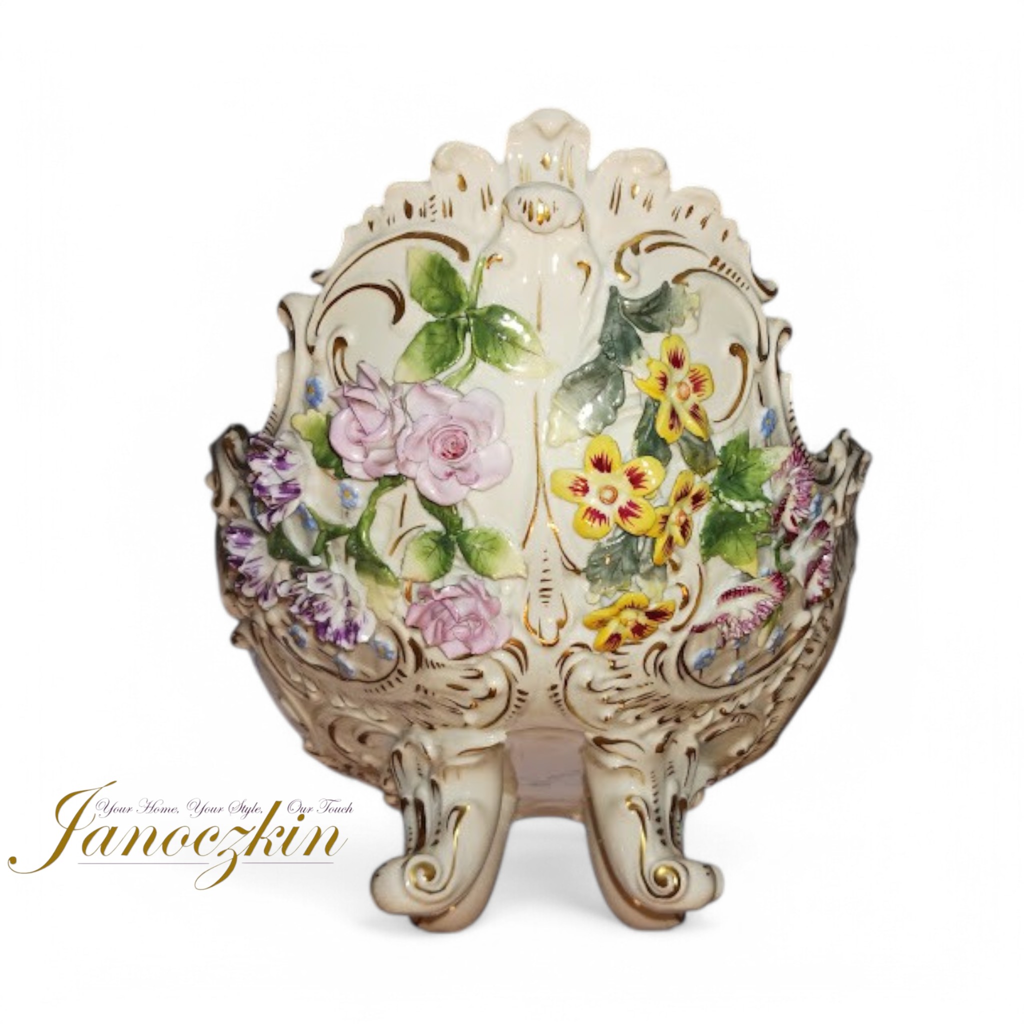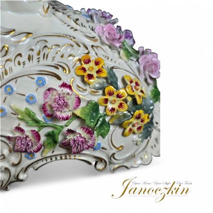 Crafted in an oval reticulated design, the bowl rests gracefully on four ornate pedestal feet, elevating its presence as a statement piece. The scalloped rim is accentuated with intricate gold gilt detailing, adding a touch of opulence. The applied flowers, meticulously sculpted and painted by hand, showcase the delicate artistry for which Dresden porcelain is renowned. If you have an issue with the shiiping on our cart you can also acquire this piece or make an offer for this beautiful Dresden porcelain at Janoczkin.com