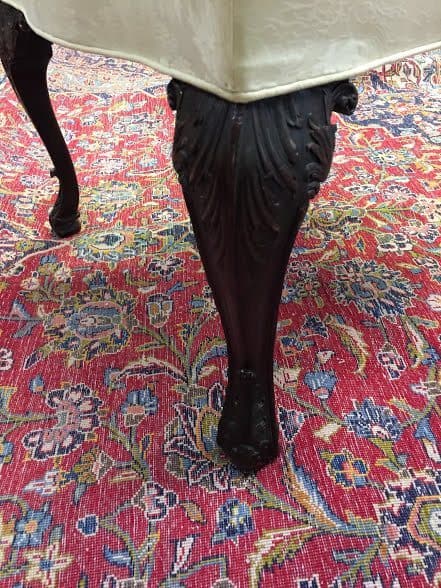 Upholstery is a nice damask but does have a few minor spots. Webbing and interior seat appears to have been redone at a later date.