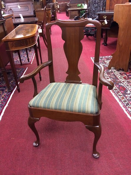 Solid Mahogany vintage Queen Anne style chairs with arms for $150 each. These beautiful colonial style chairs are not marked but are well made and of high quality.