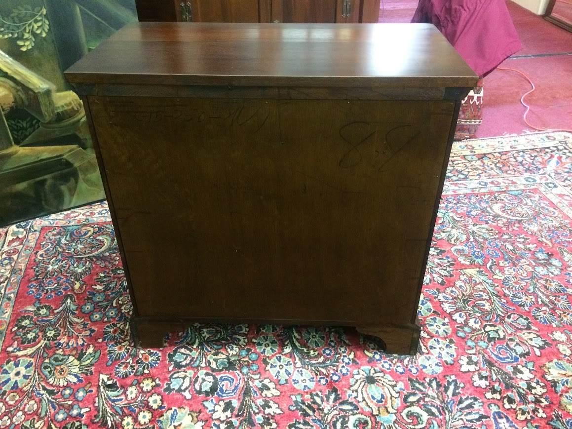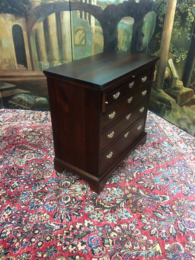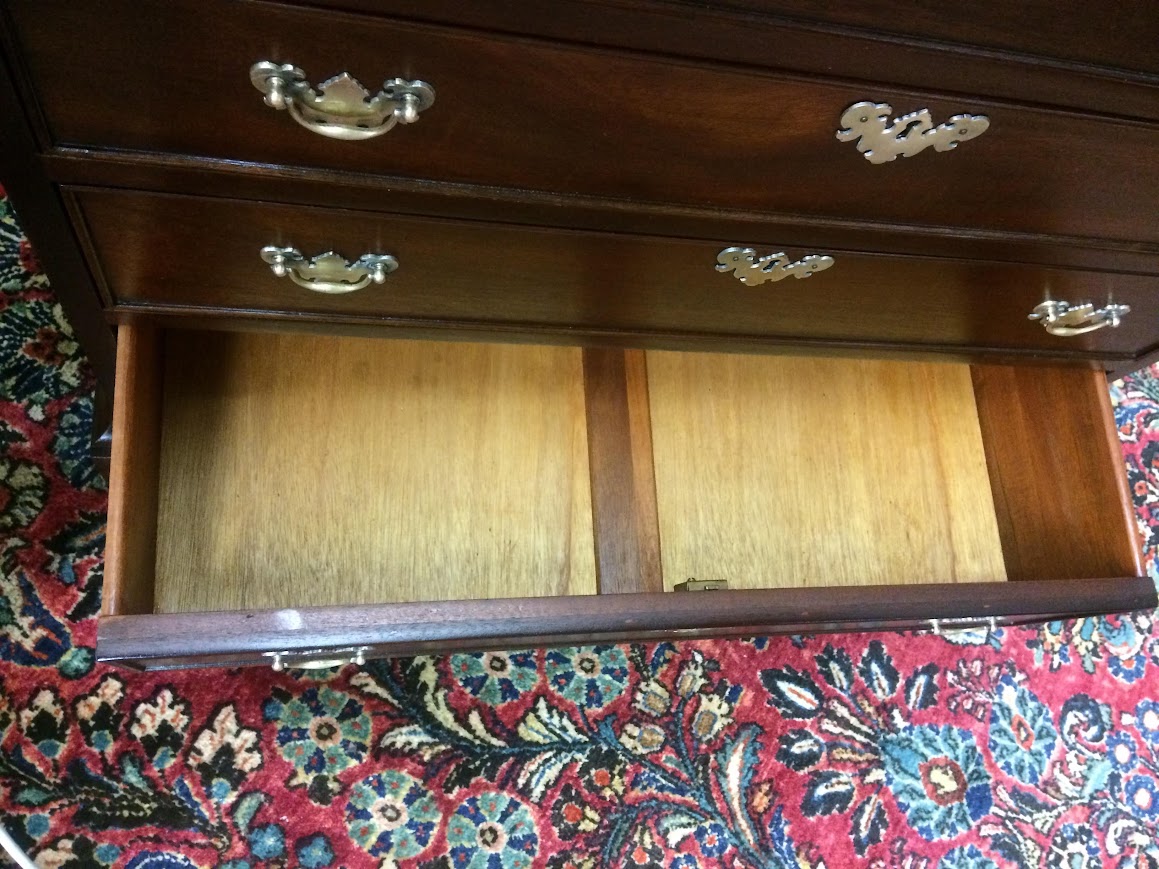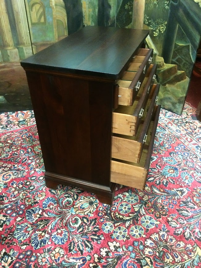 Of course, Craftique Furniture has a reputation for excellent quality and incredible mahogany woods. This small chest has a lovely design and really beautiful mahogany grain across the drawers. We refinished this chest in order to restore it. It shows very nicely.