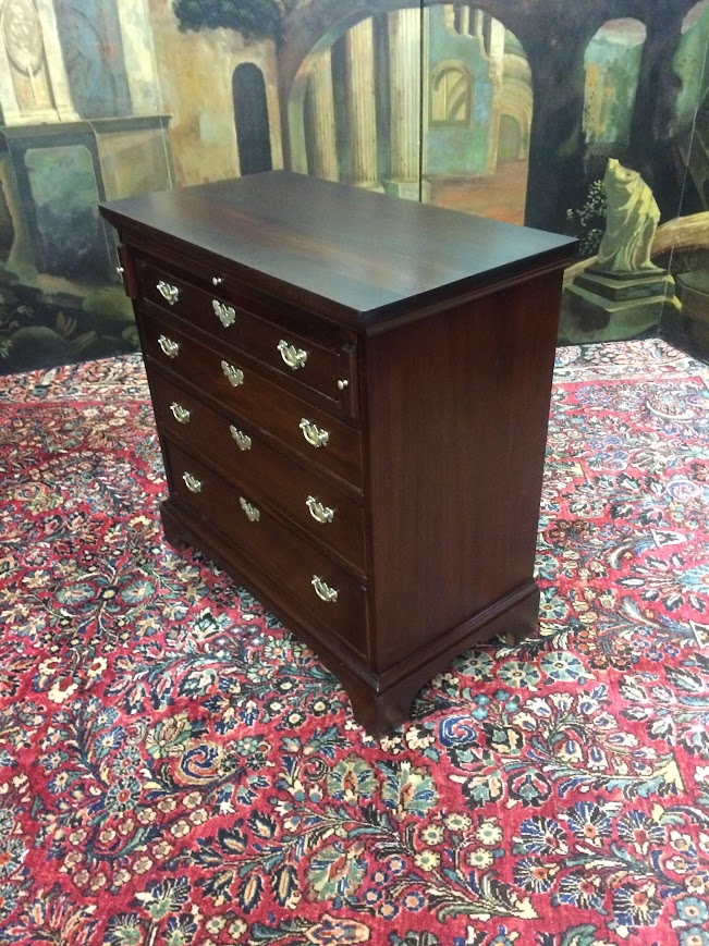 This nice piece could be used either as a mahogany server or as a bachelor chest in a bedroom. Of course, the small chest has a pull out tray, which could be used as a writing desk or for serving.