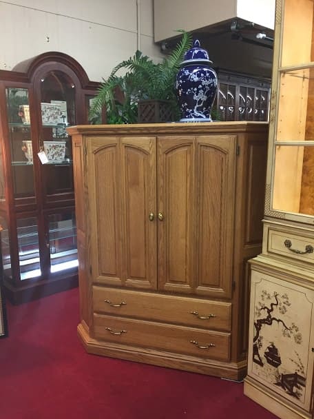 The large cabinet features a light oak wood. This makes it very adaptable for multiple style homes.