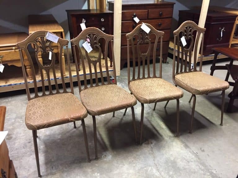 Retro Kitchen chairs with a good funky look. These metal kitchen chairs have a little French Provincial meets Kitsch style that could be very cool in a Retro home. You might want to recover the seats. There is a tear in one of the seat cushions.