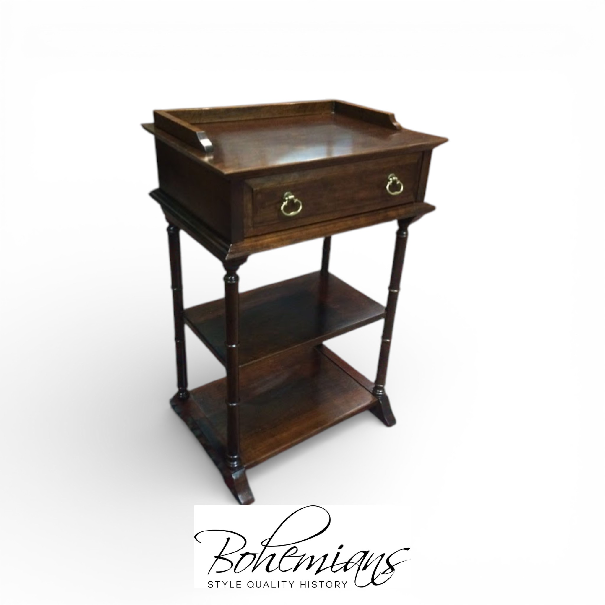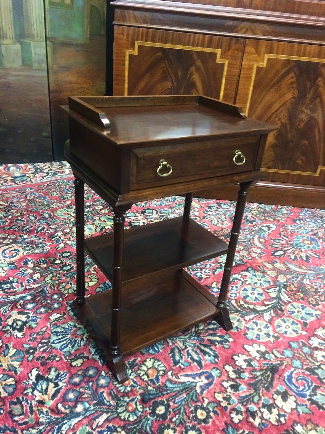 This small vintage tiered table has a cute design, and is very petite. It features one small drawer and cute turned legs and a two small shelves.
