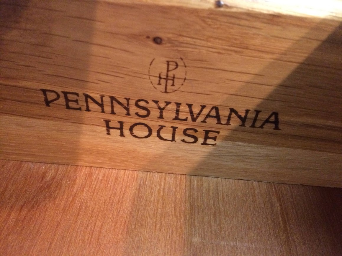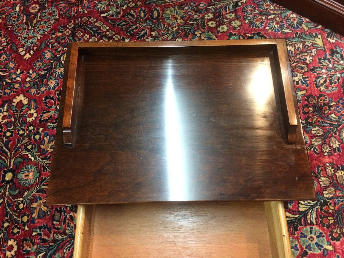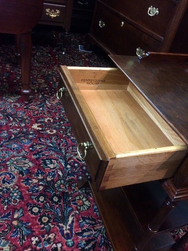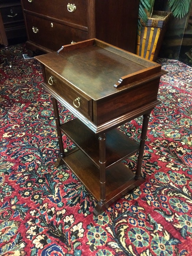 Cute small vintage tiered table in cherry wood. This Pennsylvania House accent table has a tiny drawer and a couple little shelves.