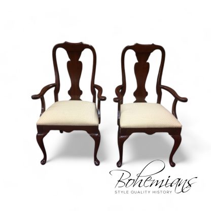 Nice vintage arm chairs in solid cherry wood. This pretty set of arm chairs were likely made by Colonial Manufacturing company.