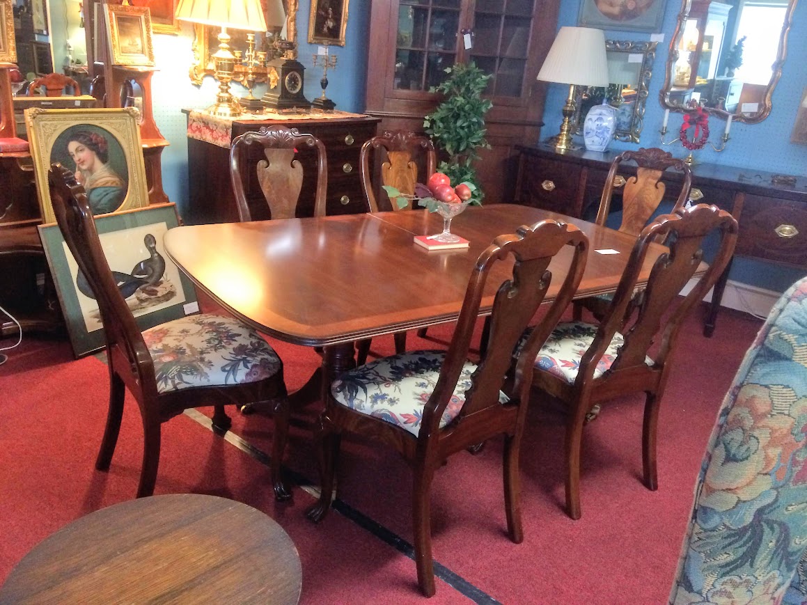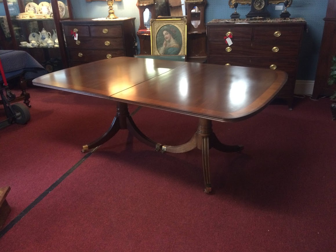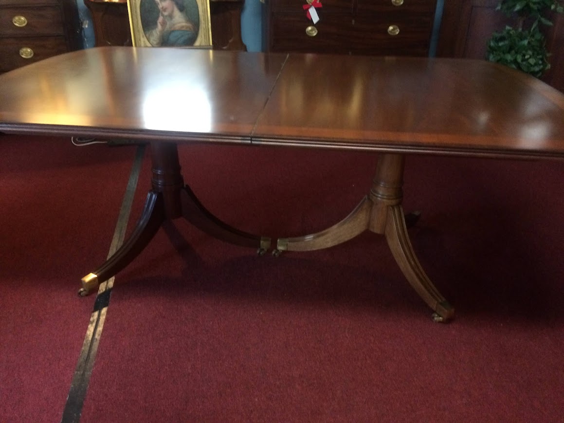 This nice vintage banded mahogany dining table has a lot of wonderful features. Firstly, it has a lovely banded mahogany top, with a ring of satinwood inlay. Certainly, this gives the table a warm glow. Additionally, it helps pull together different species and colors of wood in a room.