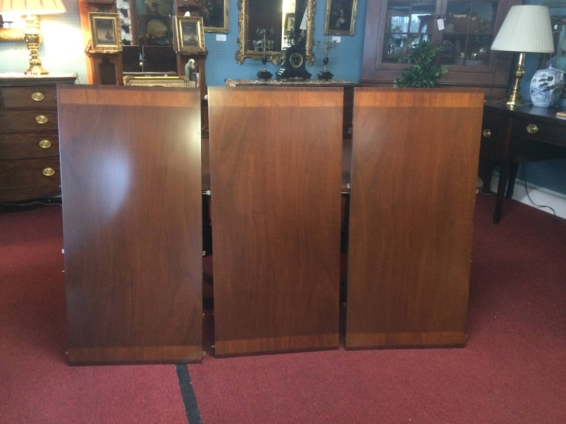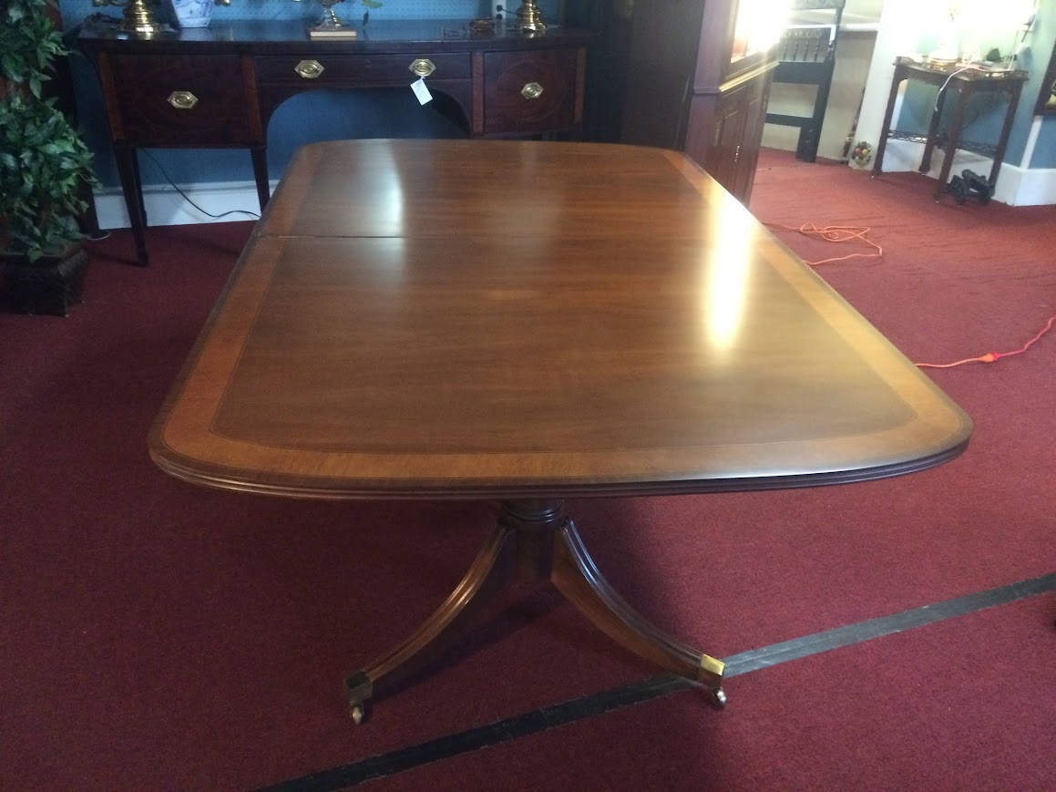 Nice vintage banded mahogany dining table by White Furniture company. This lovely vintage dining table has a beautiful design and stretches to nearly 12 feet.