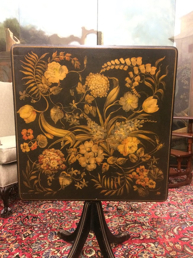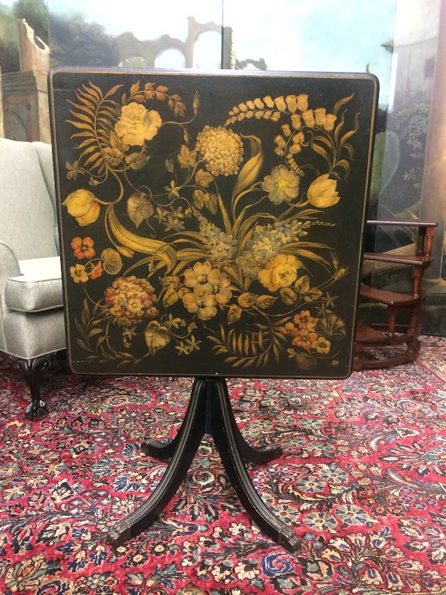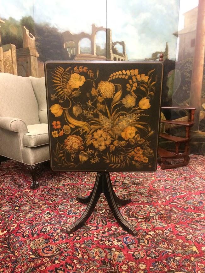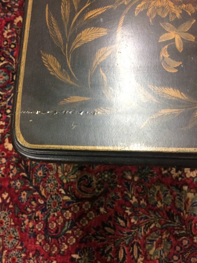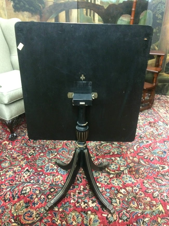Overall, the tilting card table does have some flaws and signs of age. Some chips to the top, light texture and flaking paint on the base is present.