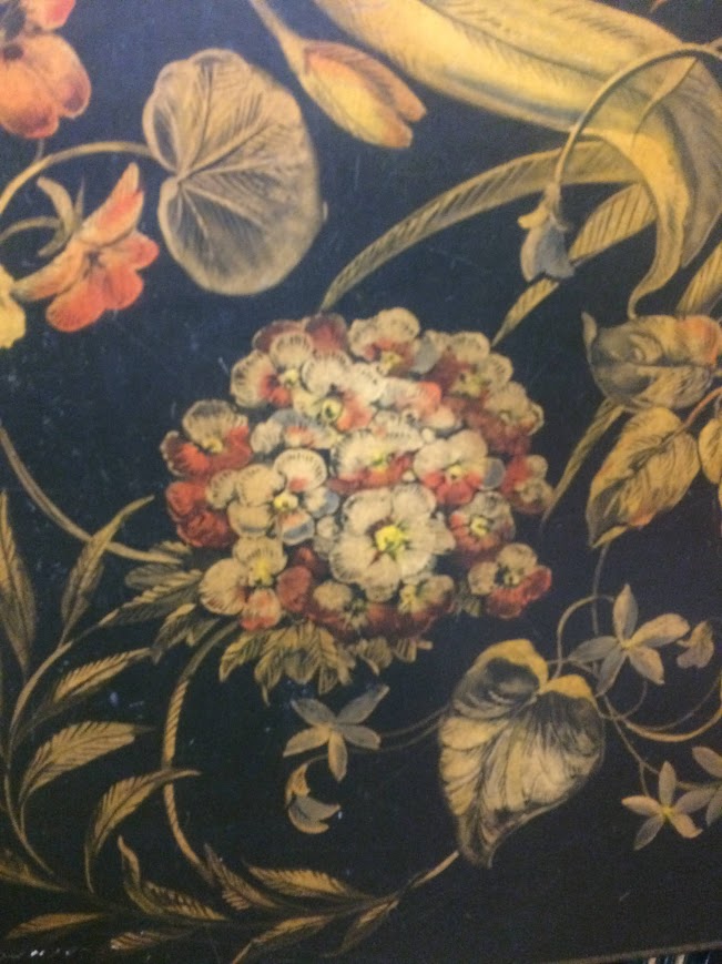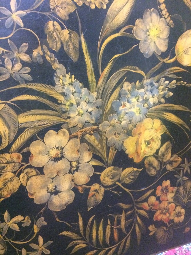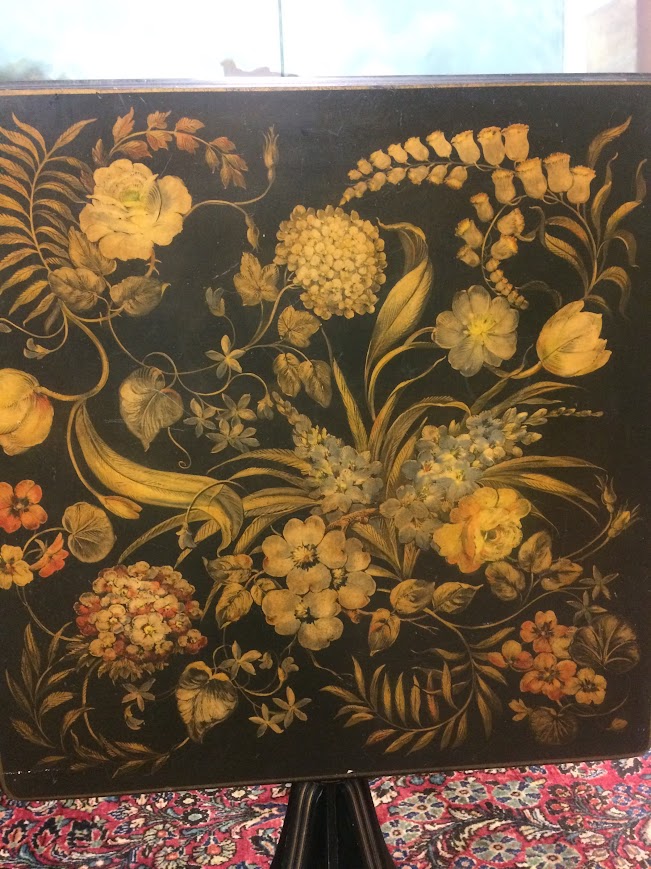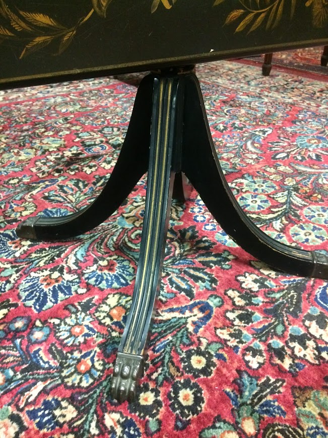 Of course, the beauty of this vintage card table is in the lovely floral design printed on the top. It features a muted color palette that almost reads as black and gold, but does have some pink, green and blue shades.