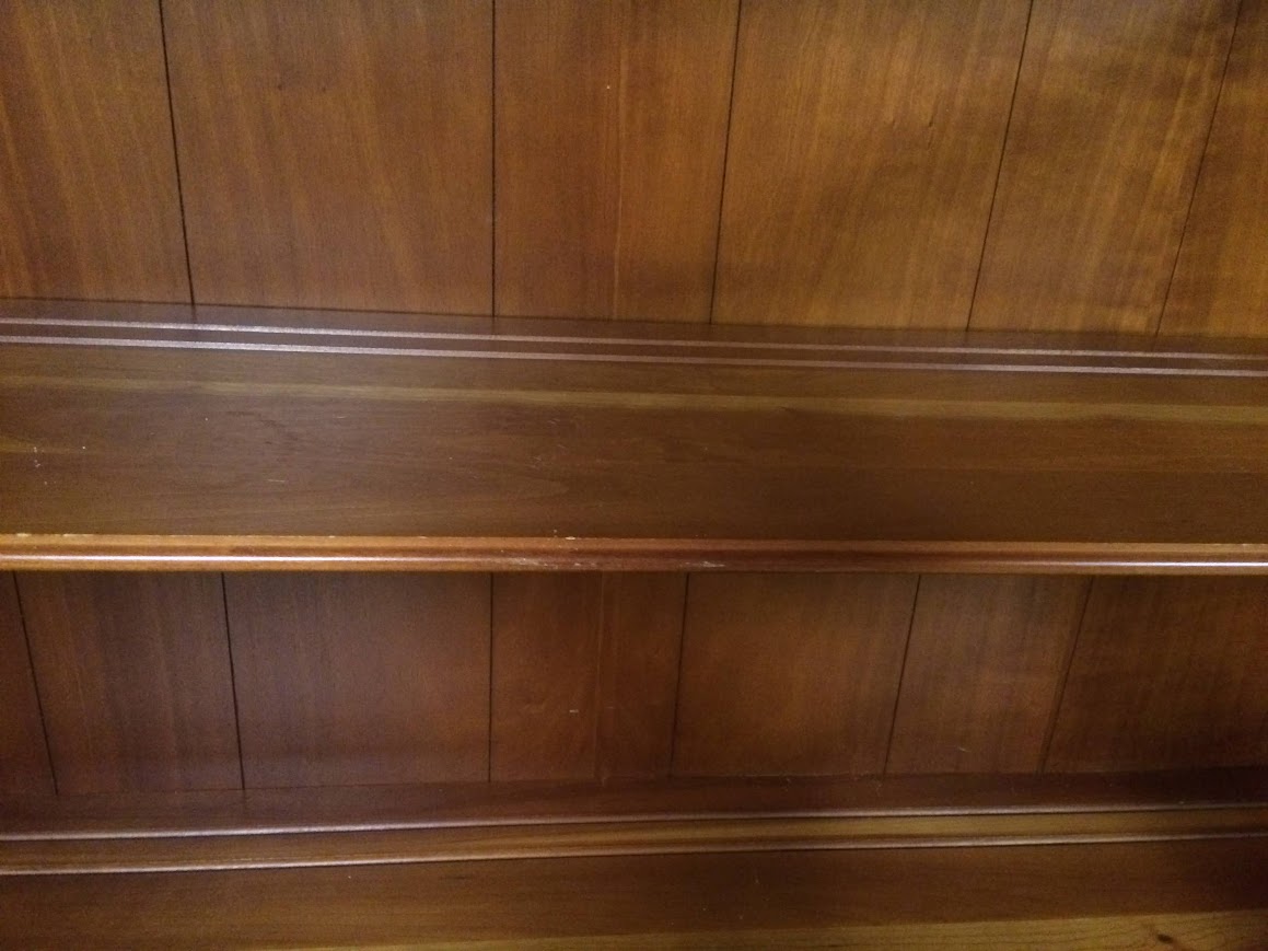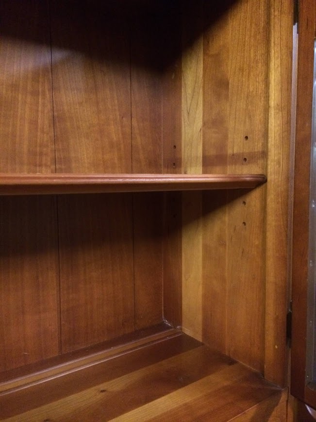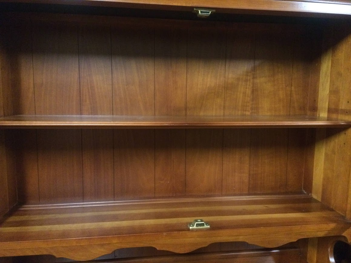 Since we have a pair of vintage cherry hutch cabinets, it makes sense to offer them either as a set or individually. The hutches are identical in design. Each hutch has a glass front on the top. Inside, there is one adjustable shelf with plate grooves.