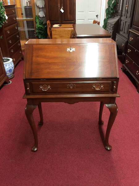 Of course the secretary desk features a drop down writing surface. Additionally, it has a lovely interior with drawers and small cubbies. Finally, the entire desk sits on tall Queen Anne legs, giving it a classic and elegant look.