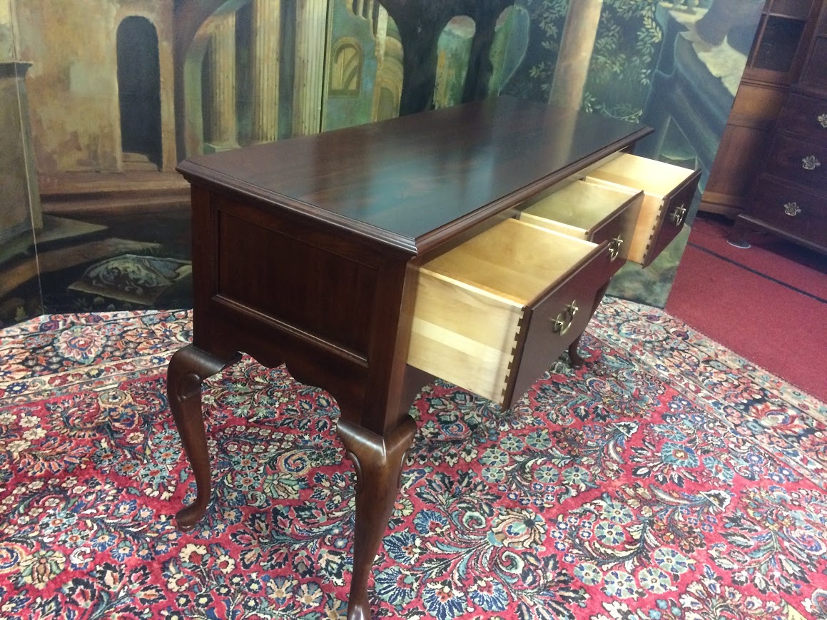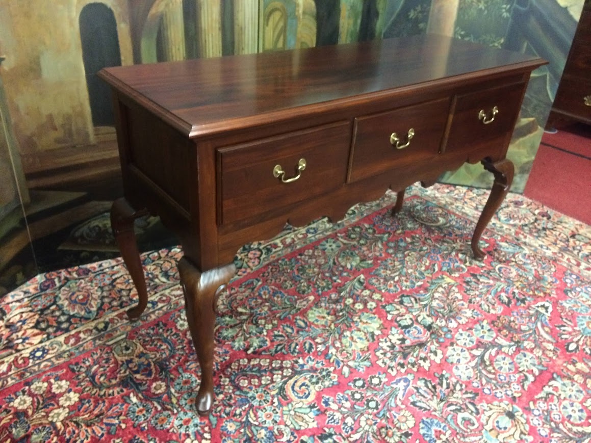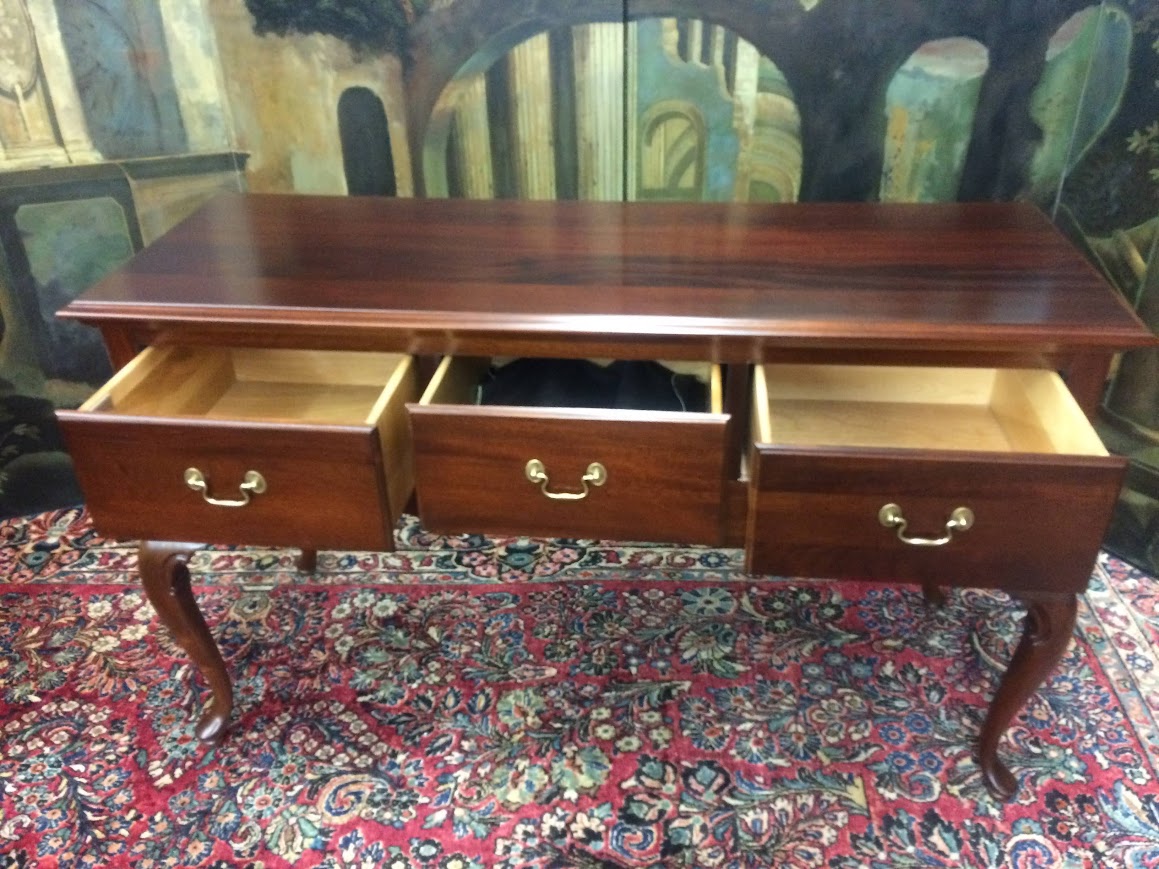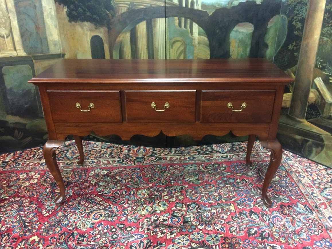 This lovely vintage console could be used in a dining room, behind a sofa, or in a foyer. It has an elegant Queen Anne design. Of course, it has three deep drawers for storage across the center. Additionally, it has a silverware lined piece in the center drawer.