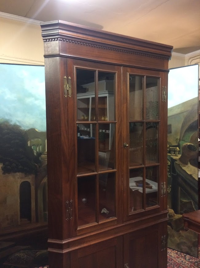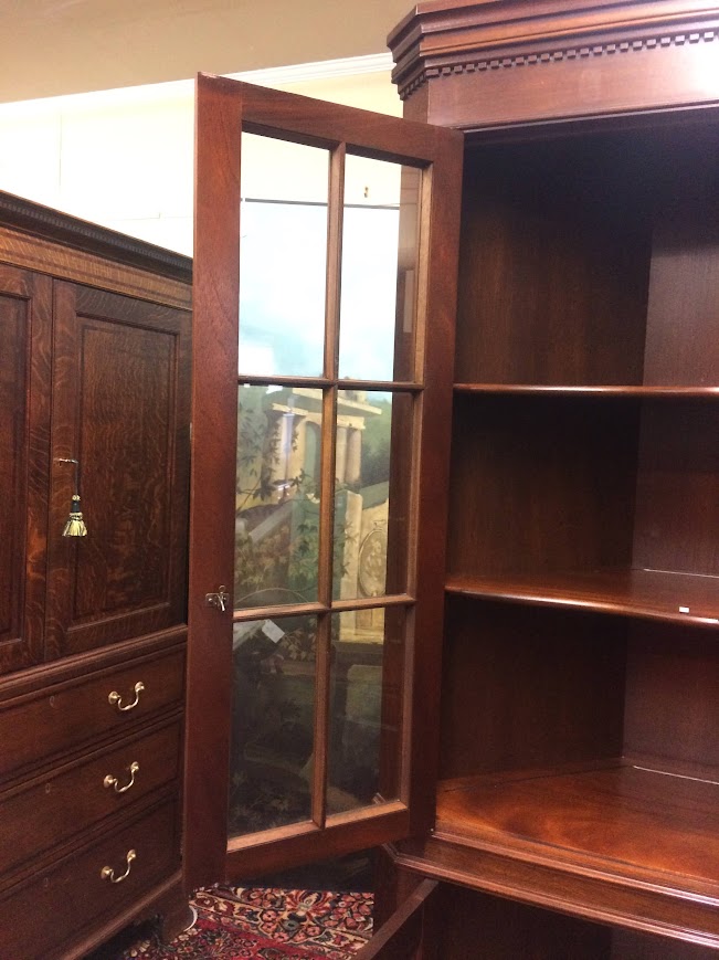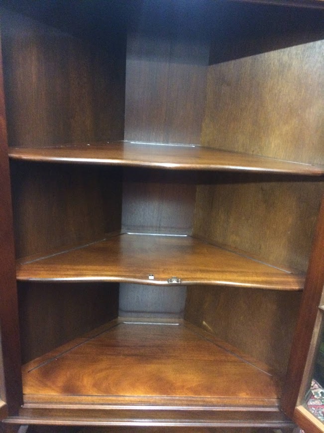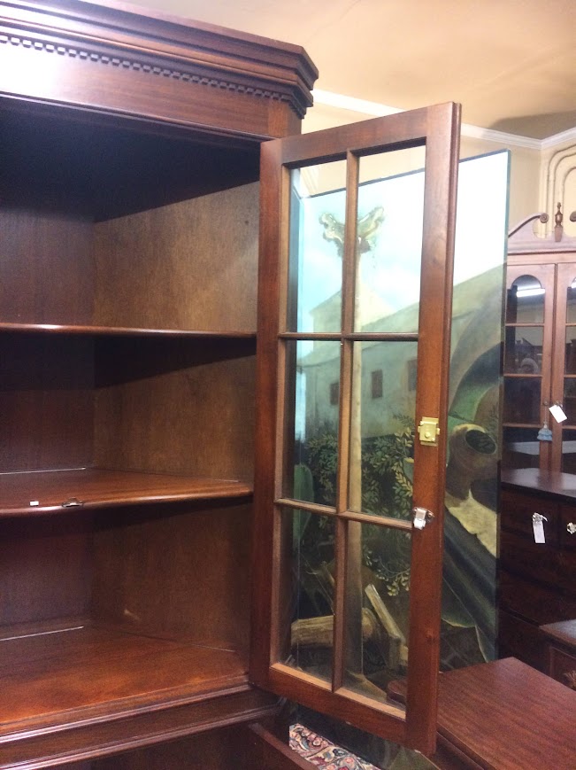 This nice vintage corner cabinet has two doors on top. Of course, each glass door features glazed glass panels. Inside the cabinet are built in shelves, with grooves for displaying plates.
