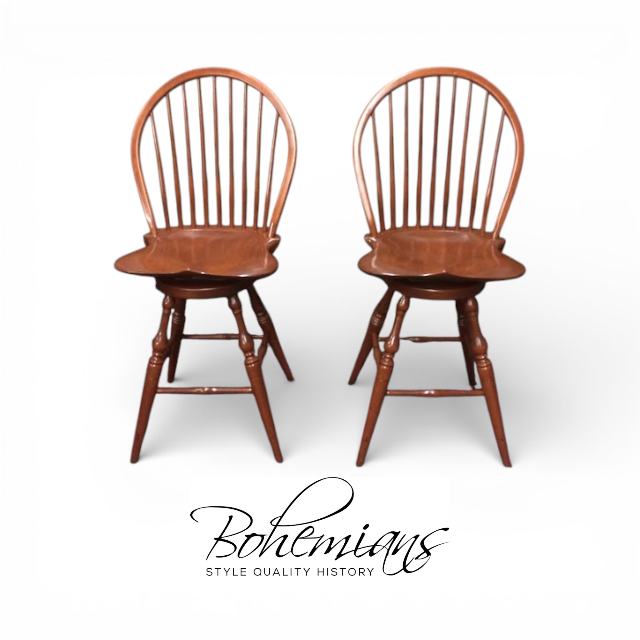 Nice quality vintage counter height stools in cherry wood. These Windsor style tall stools are great for a traditional kitchen.