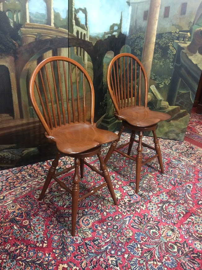 These vintage counter height stools have a nice design. They feature a rounded back with spindles. Also, they have a nice thick cherry wood seat. Finally the stools swivel to the left and right for even more comfort.