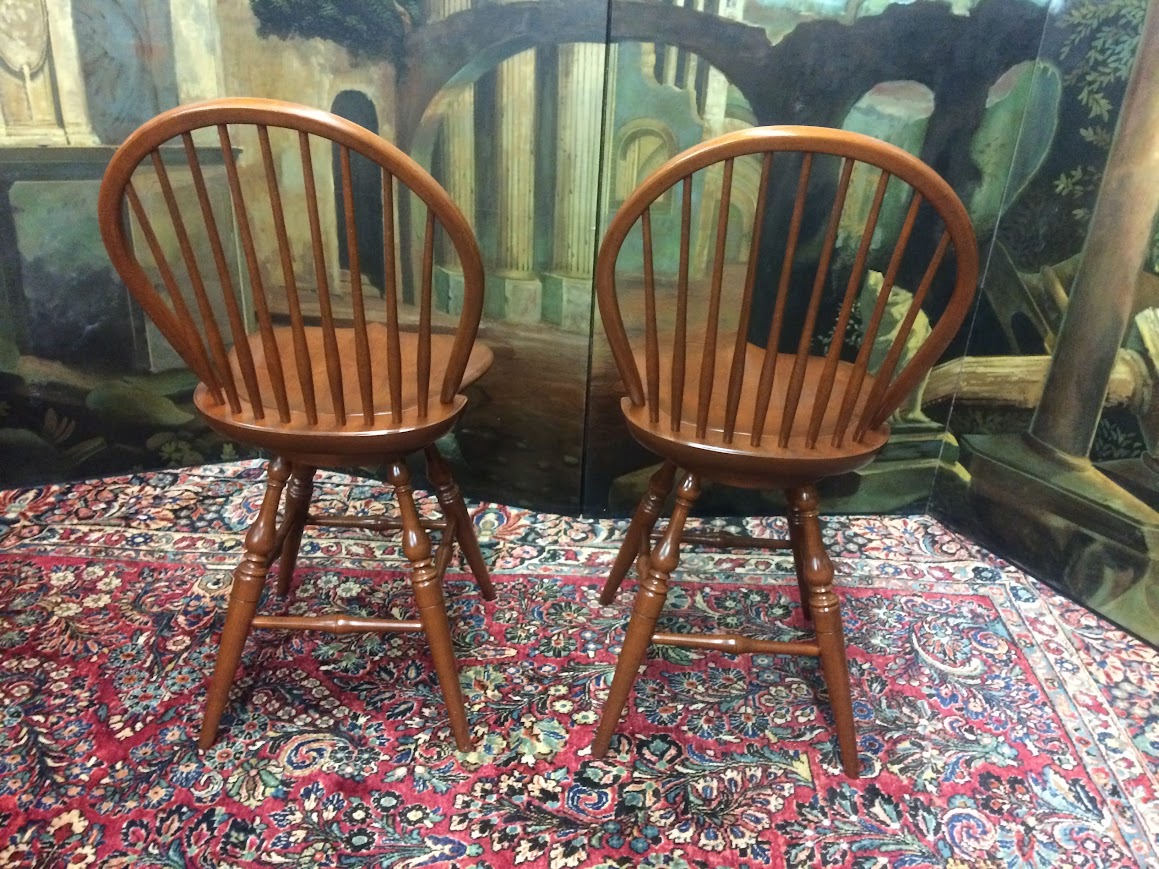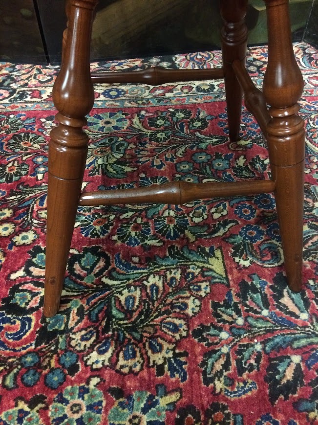 Overall these Windsor style stools are in good shape. There are minor signs of age and use, especially on the bottom front foot rungs, and a little wear along the back. That said, they still show well and are in good shape.