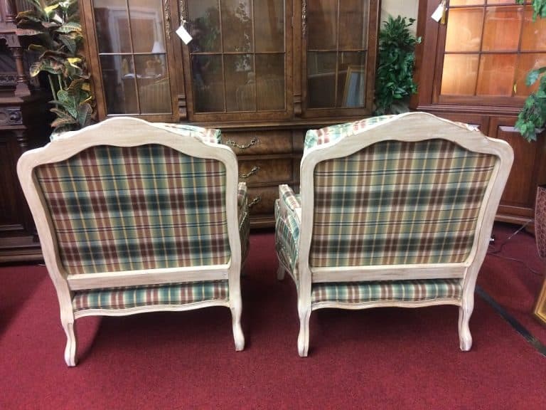 Adorable Vintage Country French bergère chairs with great plaid upholstery fabric. These nice vintage chairs have such a striking look and are very comfortable.