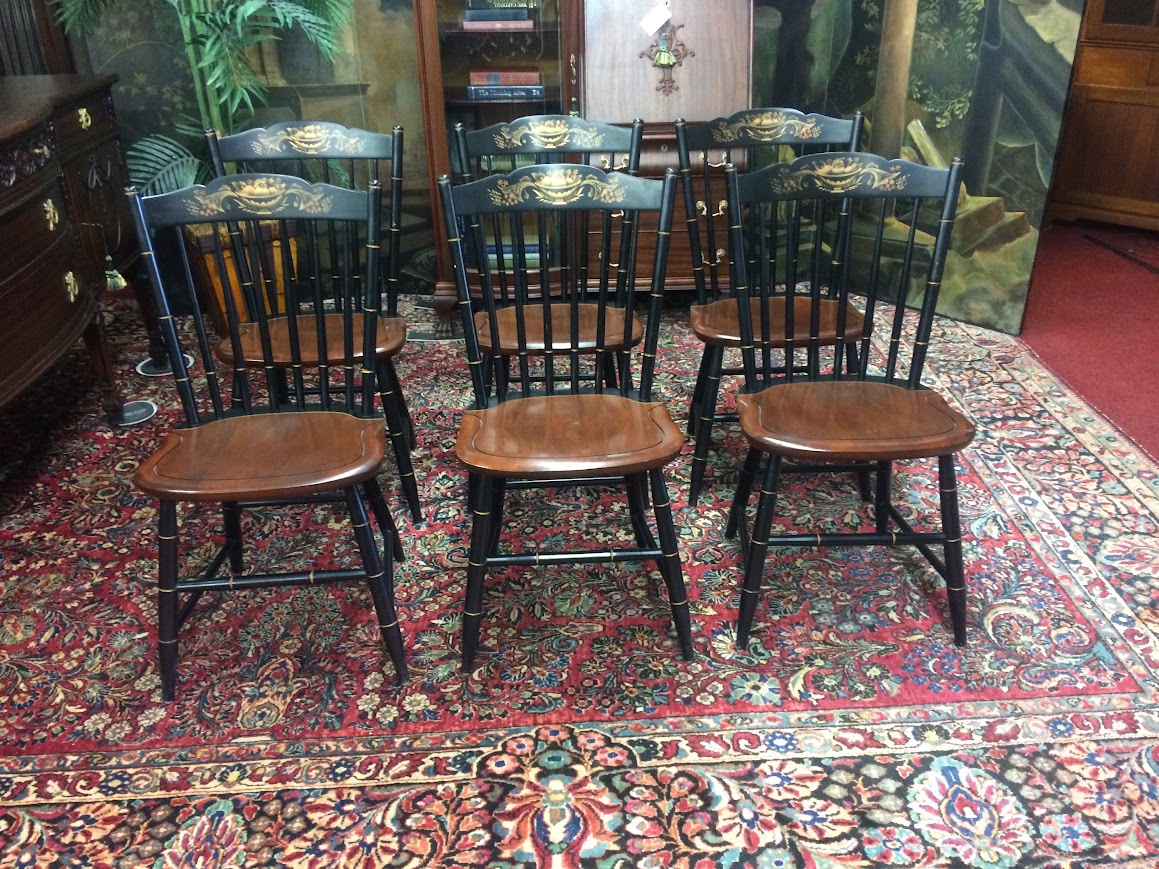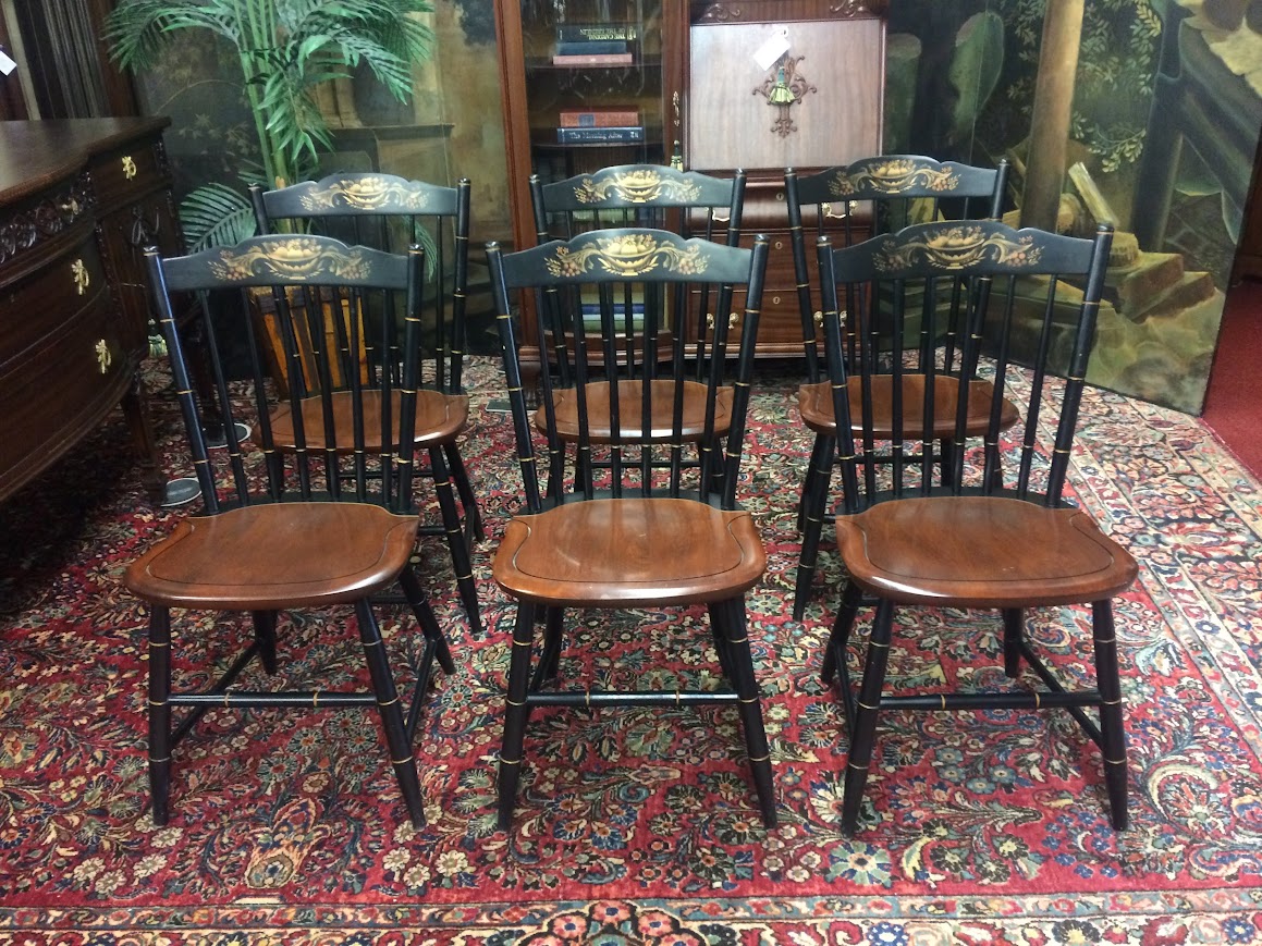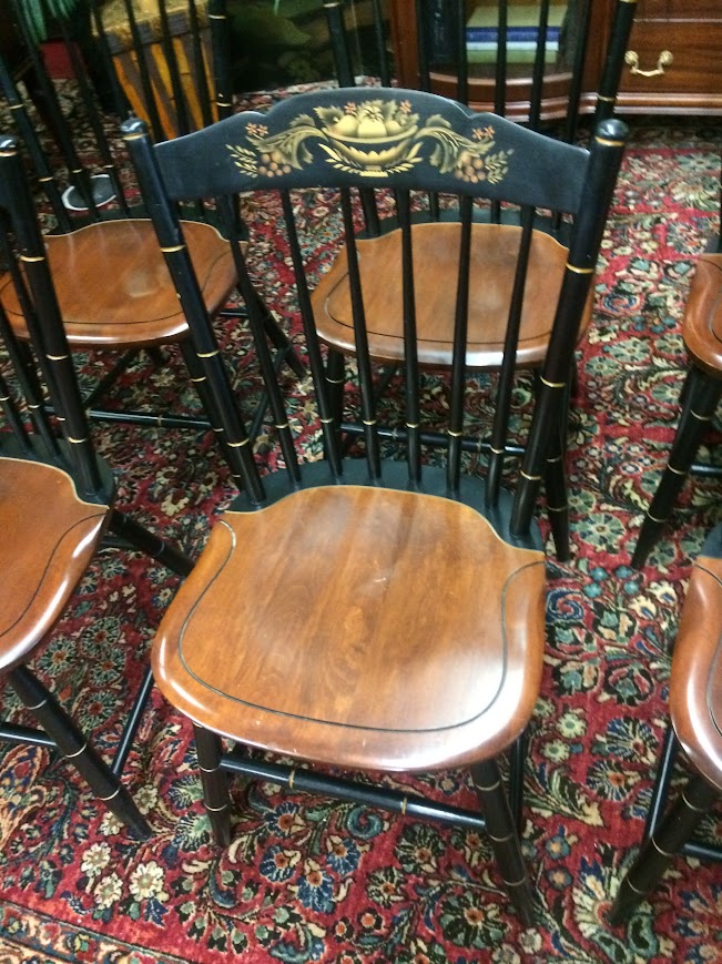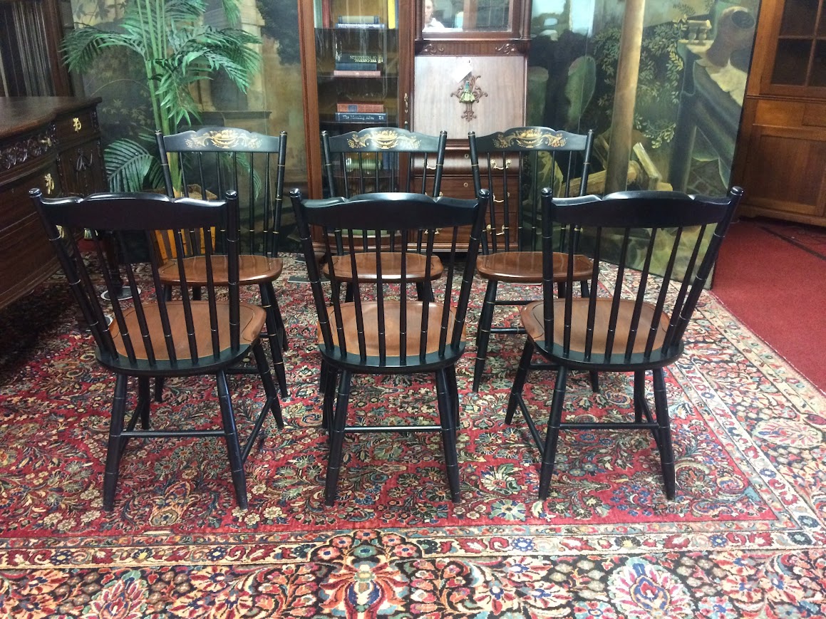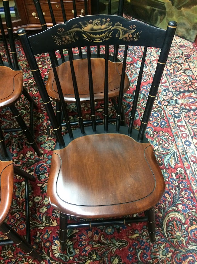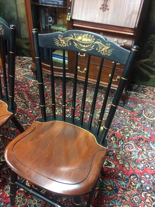 Certainly, these vintage dining chairs have a beautiful two toned look. These chairs were made by Hitchcock Furniture Company and display the signature on the back of the chairs. The seats are stained in a lovely medium brown color. Of course, the backs and legs are painted and stenciled in black and gold paint.