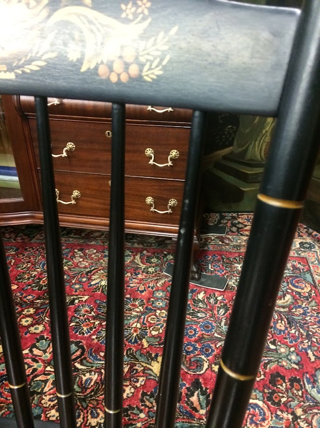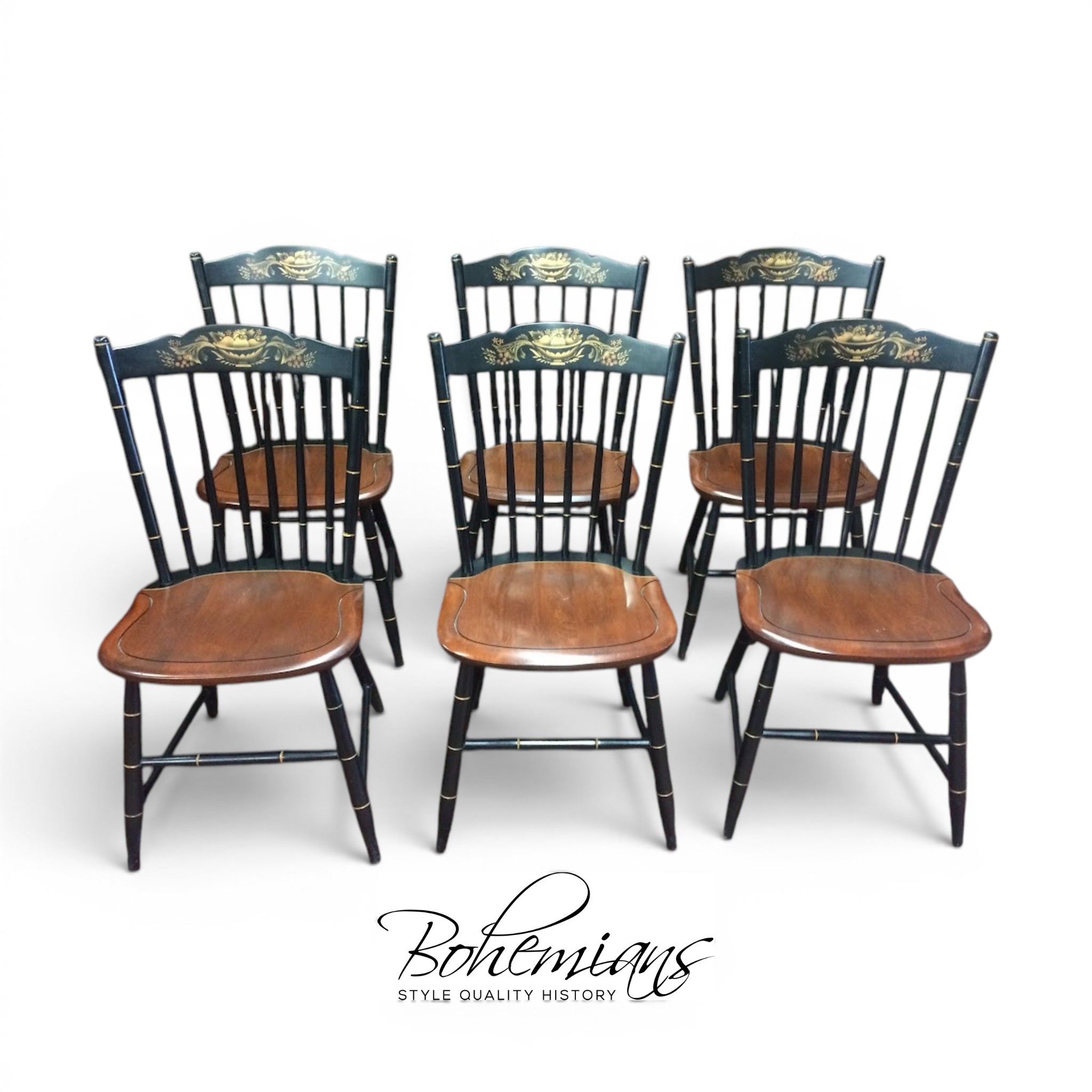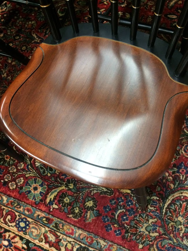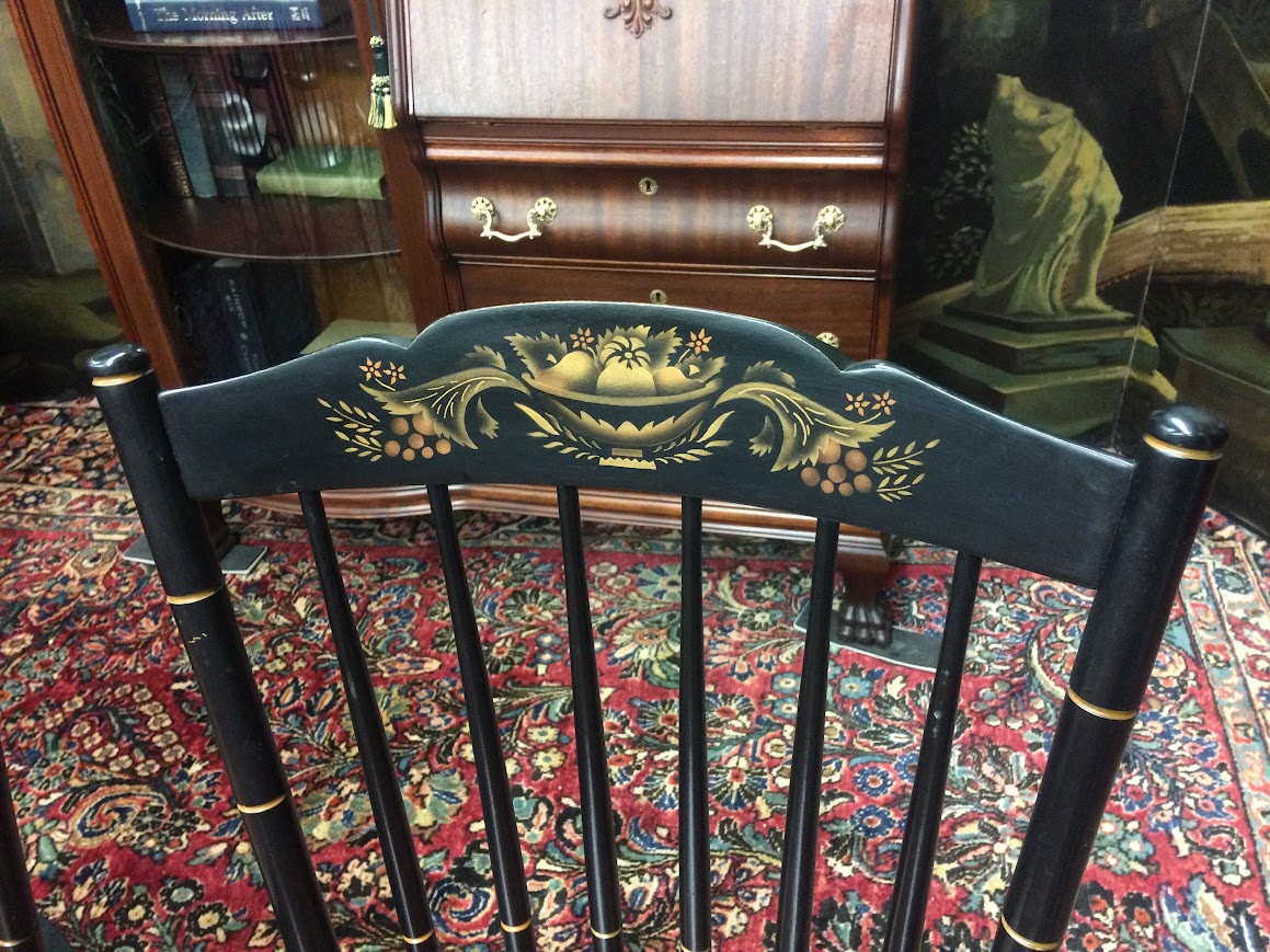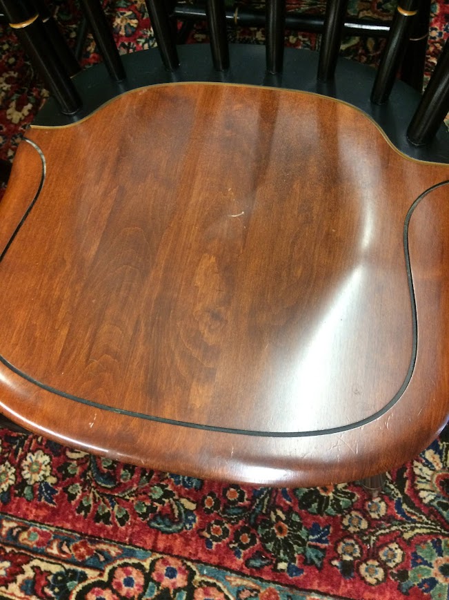 Certainly, these vintage dining chairs have a beautiful two toned look. These chairs were made by Hitchcock Furniture Company and display the signature on the back of the chairs. The seats are stained in a lovely medium brown color. Of course, the backs and legs are painted and stenciled in black and gold paint.