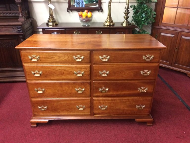 This double dresser probably dates to circa 1950-1960 from the Cherry of the Valley Line by Leopold Stickley. Certainly, the designs of this line feature a light finish and nice traditional/Colonial lines.