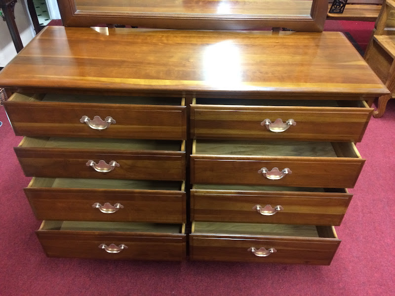 Of course, the dresser features solid cherry wood. Also, it has nice brass hardware. Additionally, the dresser has an attached scalloped mirror that attaches to the back of the dresser.